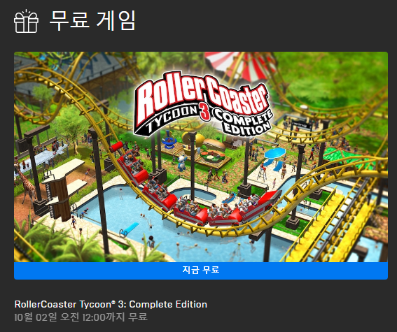 이번 "롤러코스터 타이쿤 3: 컴플리트 에디션"의 무료배포는 다가오는 2020년 10월 1일 오후 23시 59분 59초까지이니 그전에 본인의 라이브러리에 등록만 하면 영구 소장이 가능 하니 추석 연휴 때 받아놓으면 딱 좋지 않을까 싶습니다.