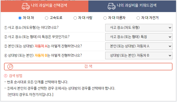 "자동차사고 과실비율 분쟁심의위원회" 라는 곳에서 운영하고 있는 포털사이트인데 차량으로 발생 가능한 모든 사건에 대한 과실비율을 정도를 알아볼 수 있으며, 필요시 상담도 가능한 곳입니다.
