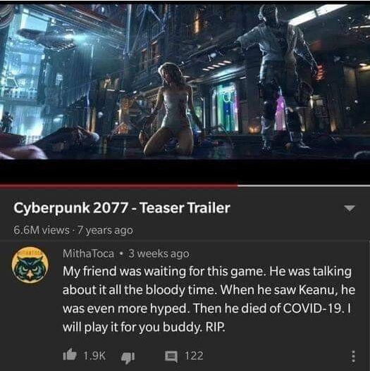 이 유저는 자신의 친구가 사이버펑크 2077의 출시를 기다려왔으며 키아누 리브스가 게임상에서 구현되었다는 소식을 들었을 때는 몹시 들뜨기도 했으나 결국 중국발 코로나 19 바이러스에 감염되어 유명을 달리하였다고 합니다. 그리고 그렇게 게임은 발매를 목전에 두고 있어 더 이상 유명을 달리한 친구를 대신하여 이 게임을 하겠다는 댓글을 남겼습니다.