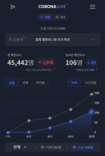 국내/세계 코로나 확진자수를 실시간으로 집계하여 제공합니다