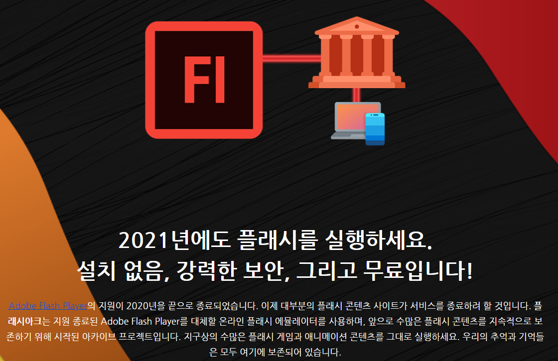 2021년 1월 1일 부로 공식적으로 지원 종료된 "어도비 플래시 플레이어(Adobe Flash Player)" 때문에 이제 WWW(월드와이드 웹) 상에서는 더 이상 플래시를 이용한 애니메이션 게임 혹은 웹페이지 구동 기술 개발 등에 사용할 수가 없게 되었습니다.