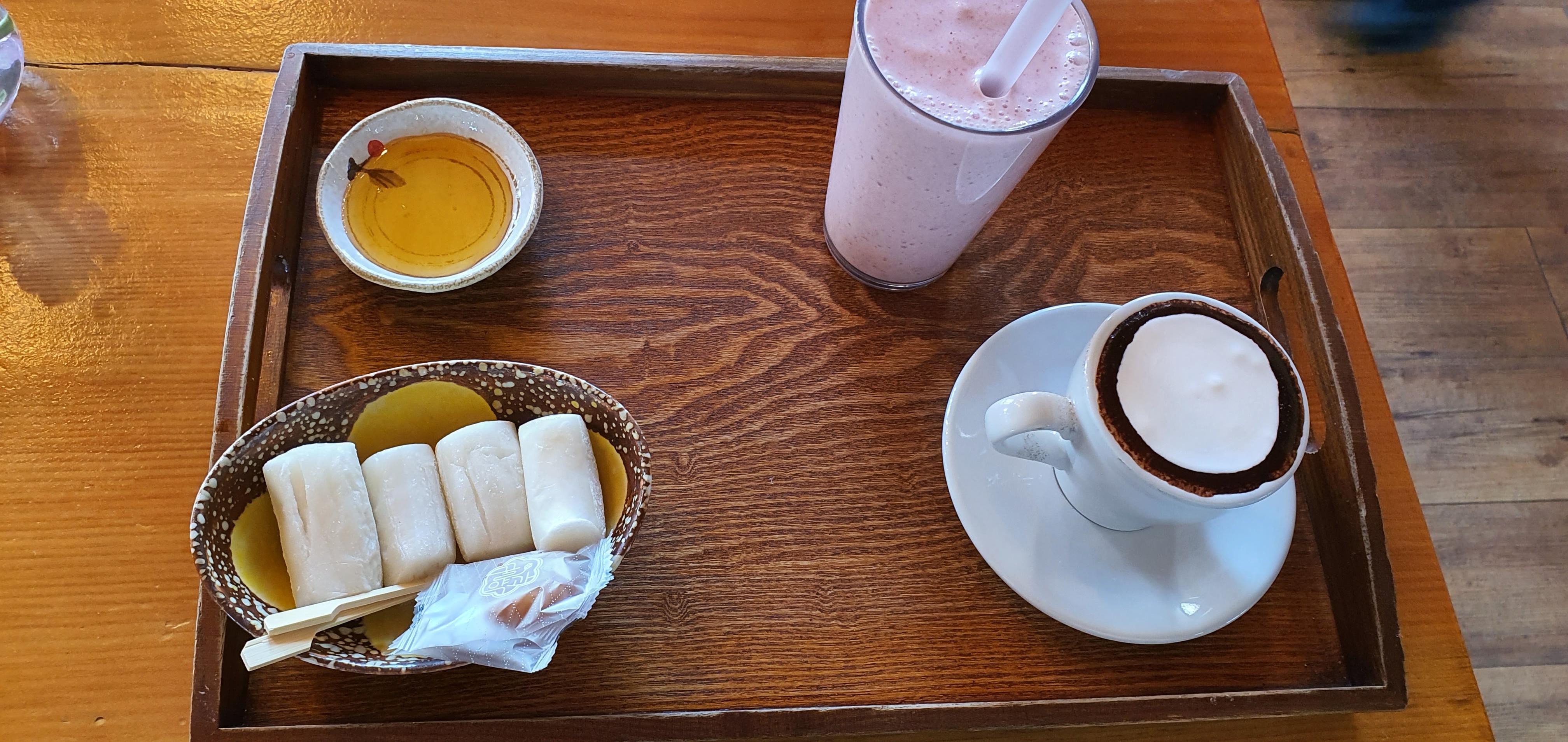 저희가 시켰던 히비스커스(따뜻한)와 딸기바나나 조합입니다. 둘 다 새콤하니 너무 좋았고 같이 있는 구워진 가래떡과 찍어먹을 꿀은 같이 곁들여져 나왔는데 이게 어떻게 구웠는지 하나도 안 타고 쫀득쫀득 하니 딱딱한 감도 하나 없이 너무 맛있었습니다.