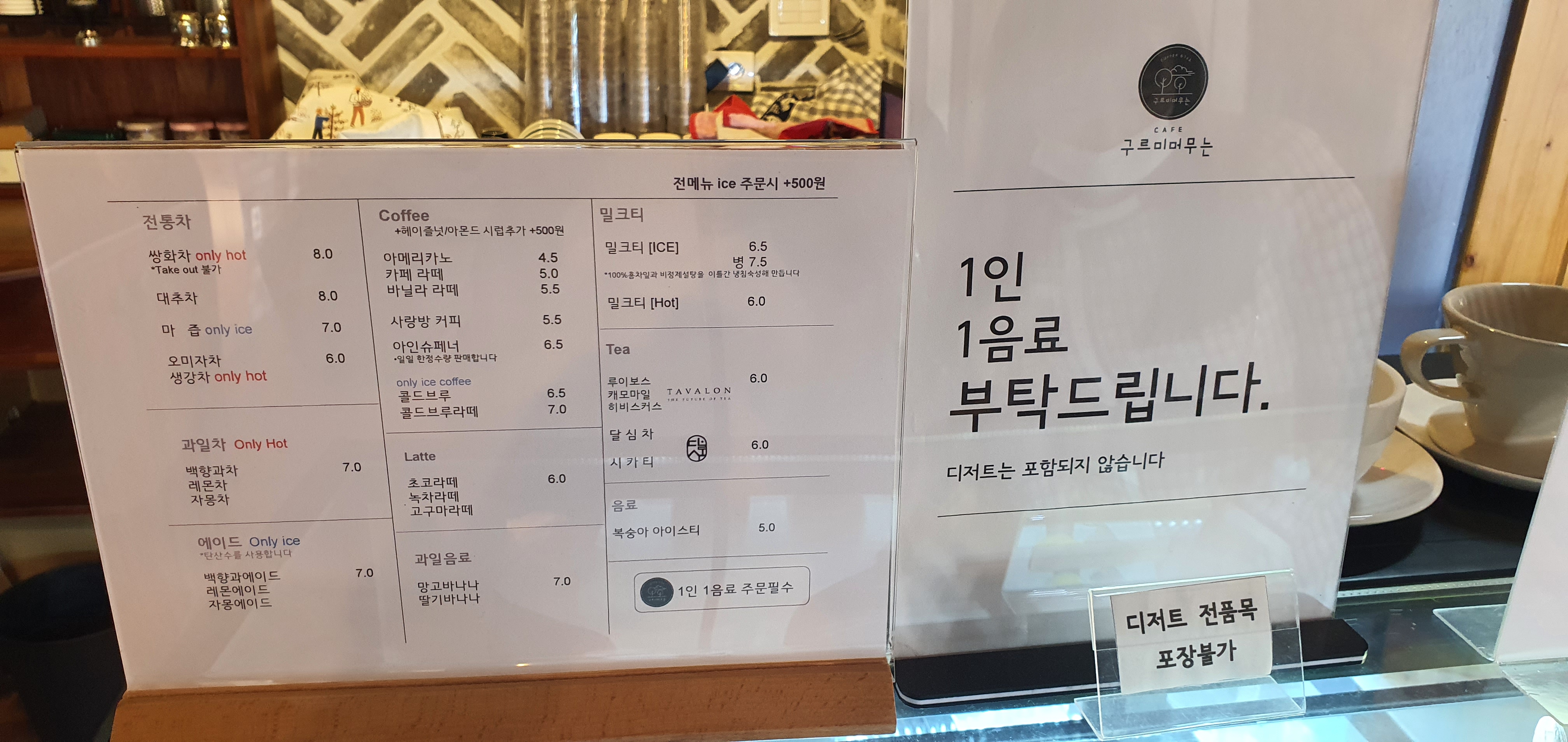 1인 1 메뉴는 꼭 주문하셔야 하고요 기본이 카페이기 때문에 일반적인 카페에서 만드는 메뉴들은 대부분 판매를 하면서도 한옥 카페다운 전통차 종류도 많으니 취향대로 주문하시면 될 듯합니다.