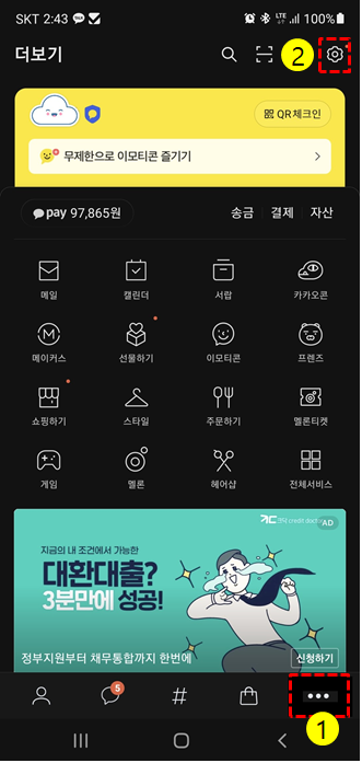 카카오톡을 실행하셔서 하단에 보이는 메뉴중 하얀 점 세 개를 누르시면 나오는 상기와 같은 화면에서 우측 맨 상단에 있는 톱니바퀴를 눌러 줍시다.