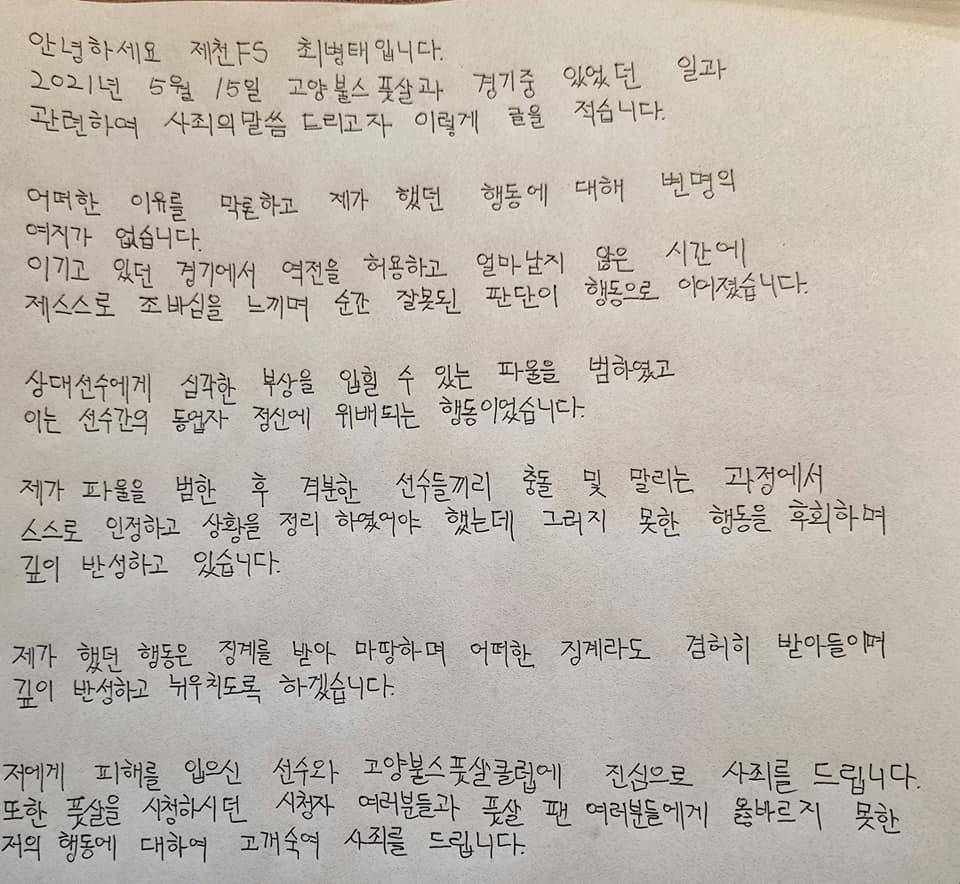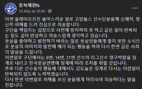 결국 이 경기는 4-7로 충북제천FS 팀이 패하게 되고, 각 팀당 2명의 선수가 폭행등의 연유로 인하여 경기에서 퇴장당하는 초유의 결과를 만들어냄 그리고 이 경기에 대한 내용이 고스란히 방송으로 타게되고 지난 5월 16일 충북제천FS의 3명의 선수가 충북제천FS의 공식 페이스북 페이지에 자필 사과문을 게재하게 됩니다.