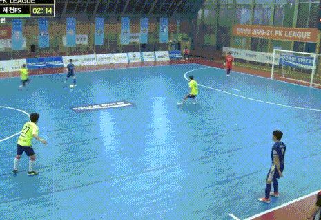 충북제천FS의 14번 선수가 고양불스풋살클럽팀의 7번 선수를 말 그대로 발로 차서 경기장 밖으로 내동댕이 칩니다.
