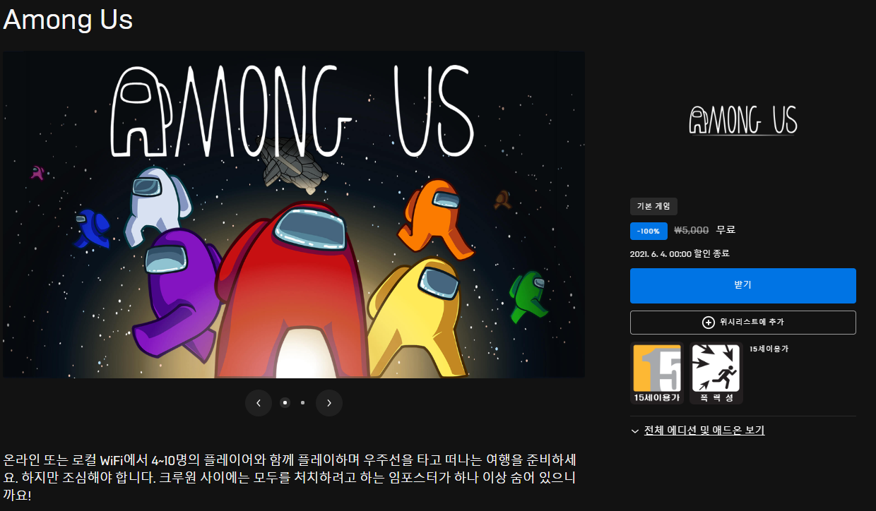 에픽스토어 어몽어스(AMONG US) 한시적 무료 배포(~6/4)
