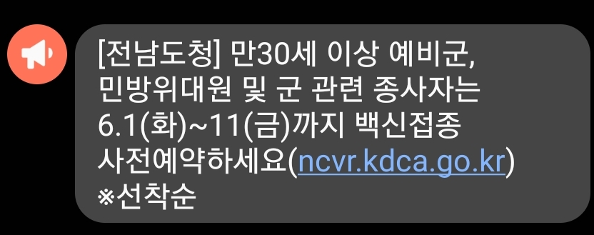 이렇게 전달받은 백만여 개의 얀센 백신은 군에 종사 중인 현역, 예비역, 민방위 등의 인원들에게 우선 접종 대상으로 지정이 되어서 며칠 전 해당 인원들에게 사전예약을 독려하는 메시지가 보내졌고 저 역시 해당이 되었습니다.