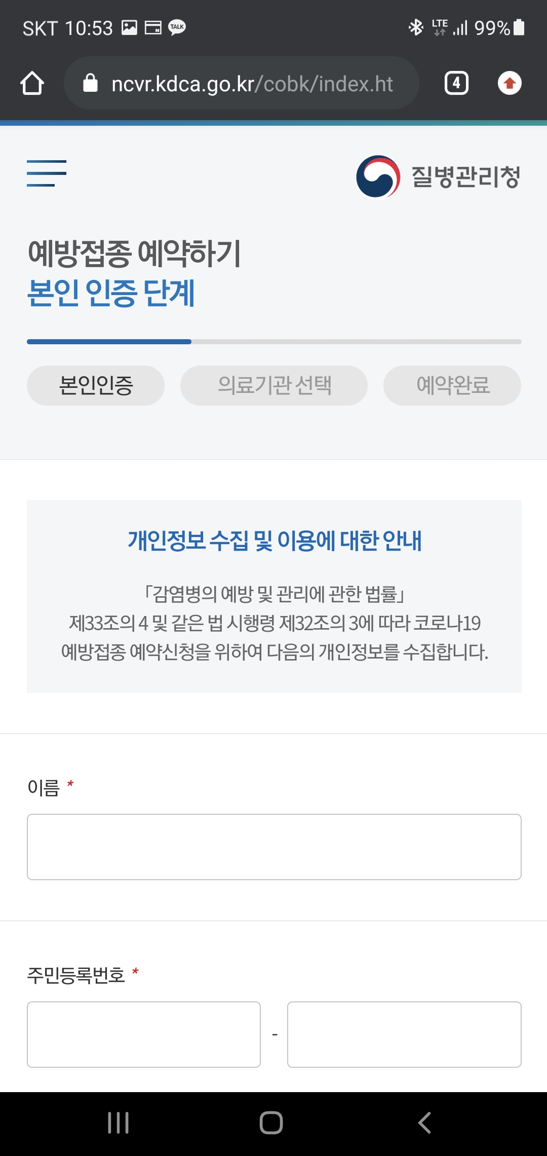 이름과 주민등록번호를 입력해야만 정부의 의료 데이터 베이스에 접종 대상자 등록도 될뿐더러 의료혜택을 위해선 당연히 기입을 해야 하는 부분이기 때문에 개인정보를 입력해 줍니다.