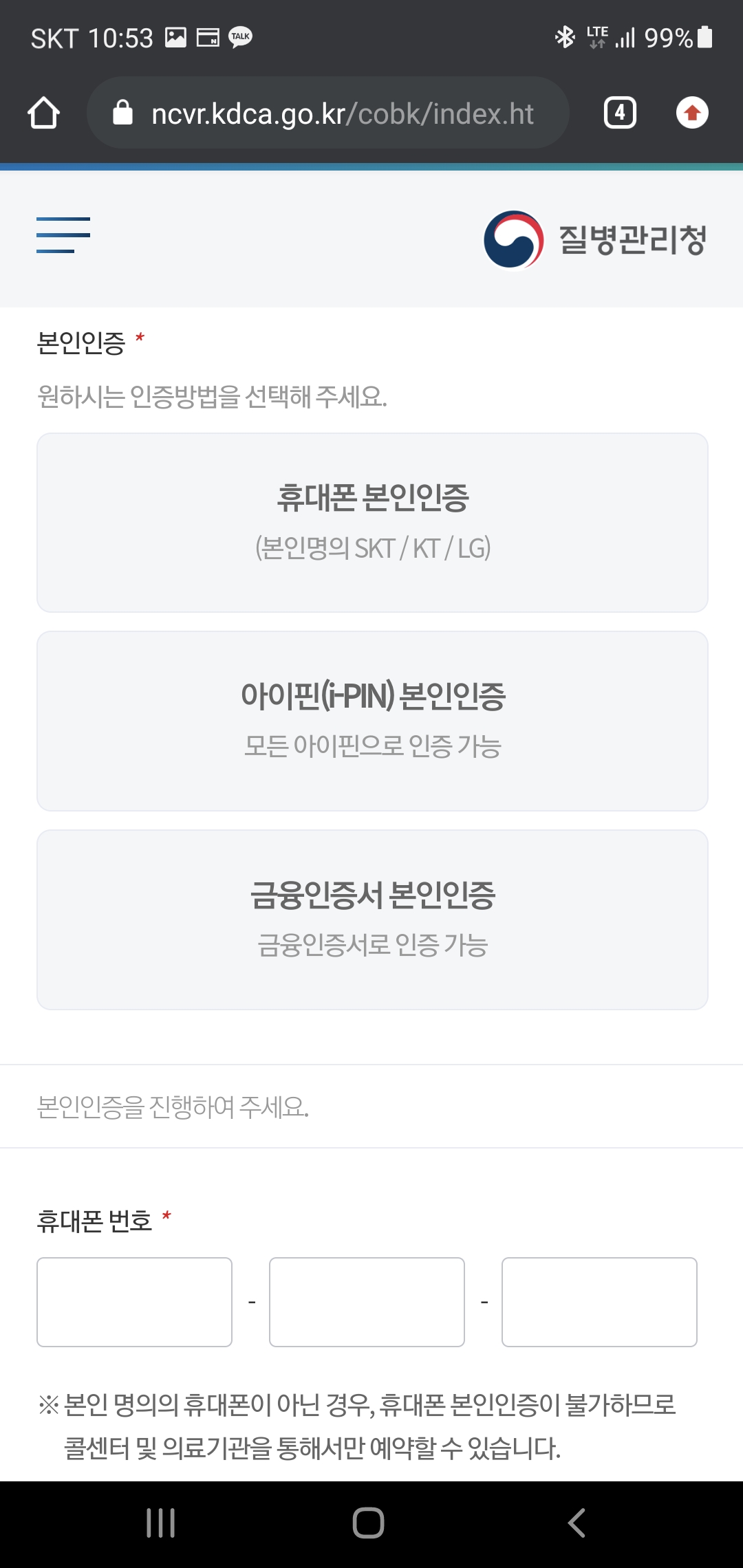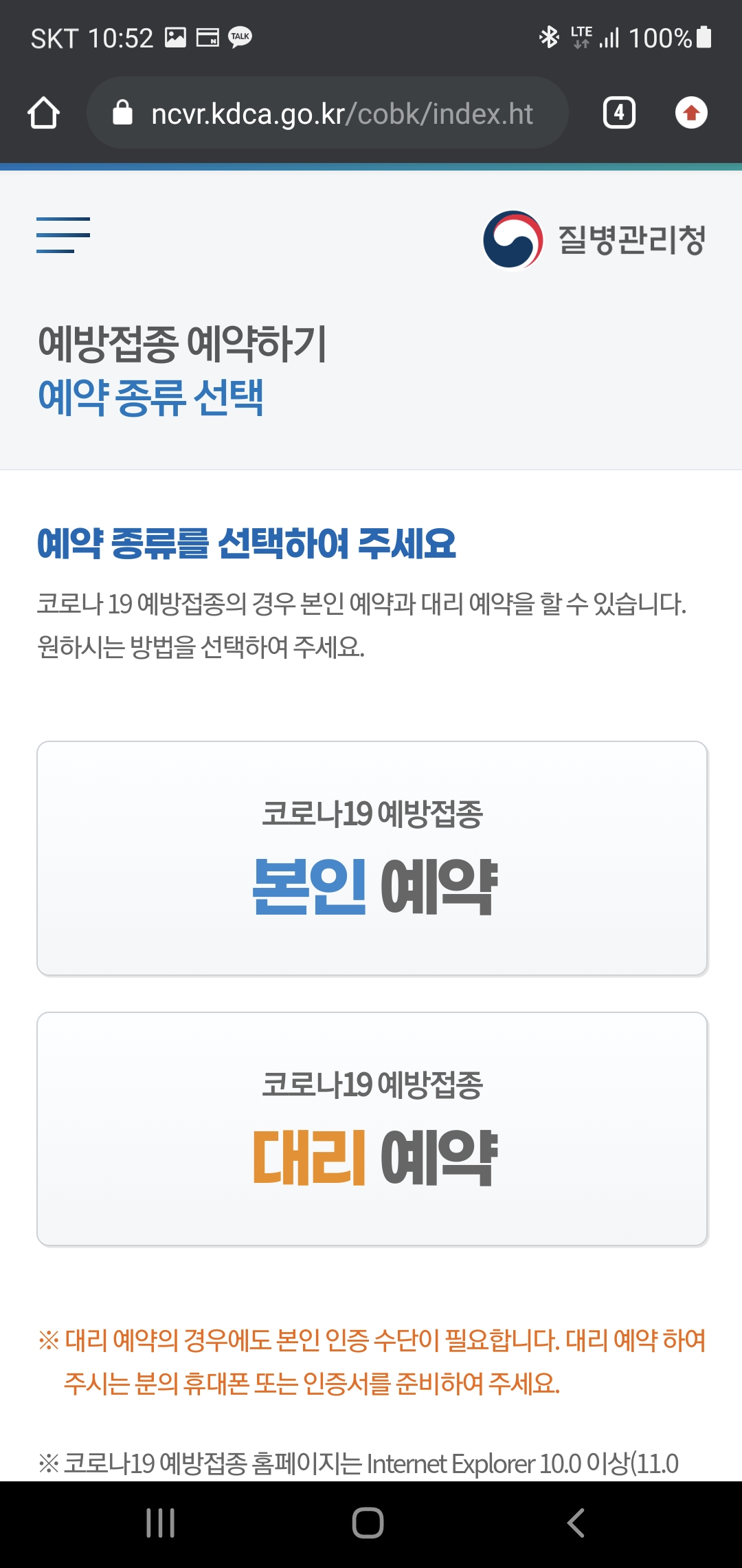 저는 제 자신이 직접 예약하고 직접 접종도 받을 거니까 "본인 예약"을 진행.