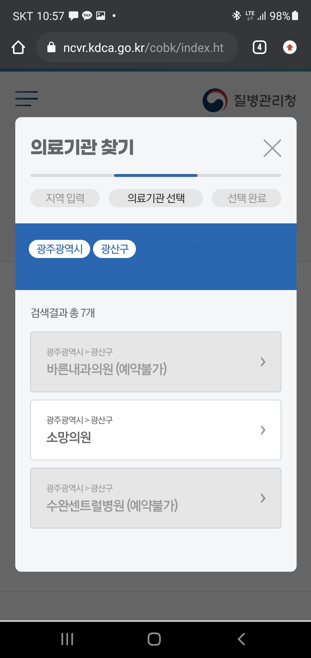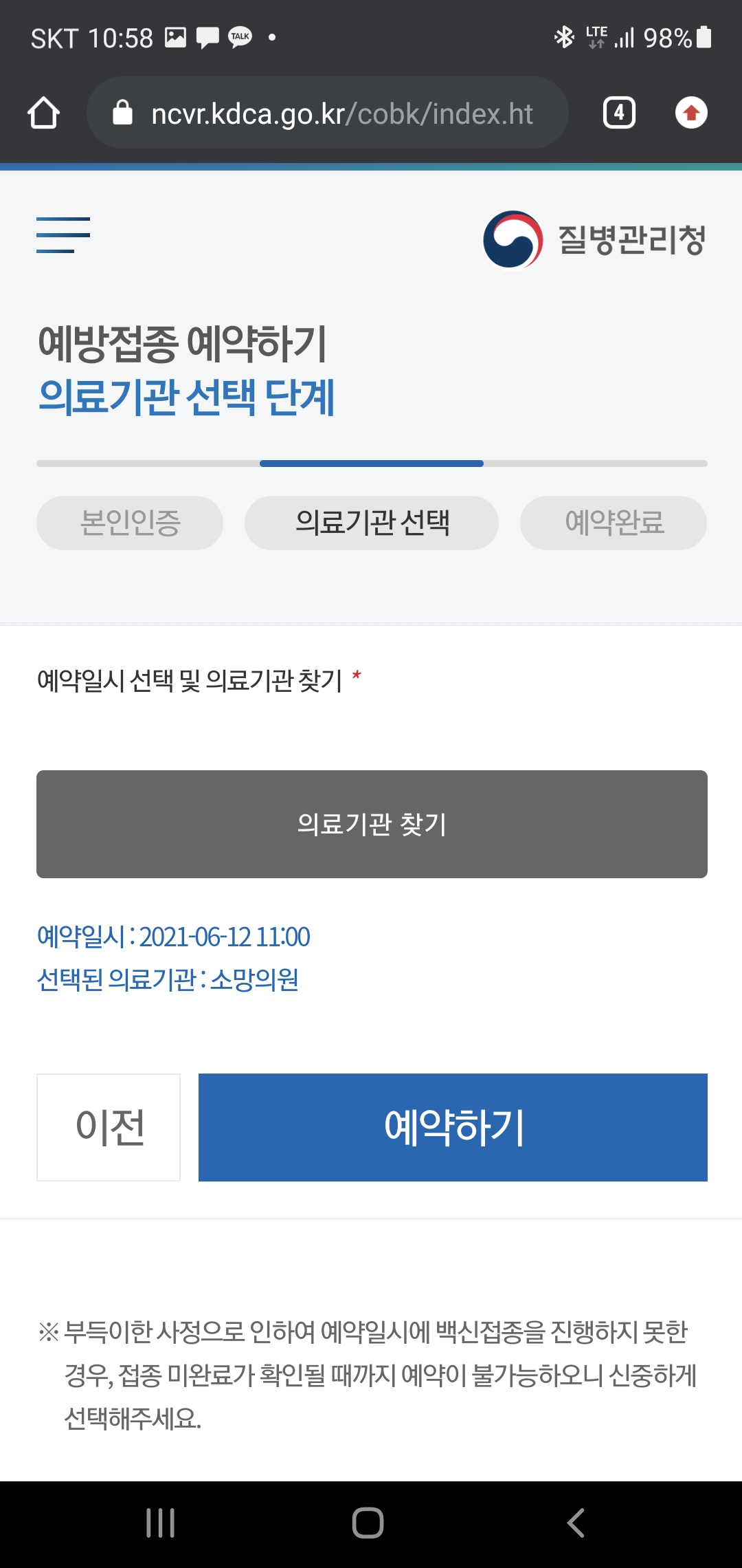 자신이 거주 중인 지역을 기반으로 현재 접종 예약이 가능한 병원을 나열해 줍니다.