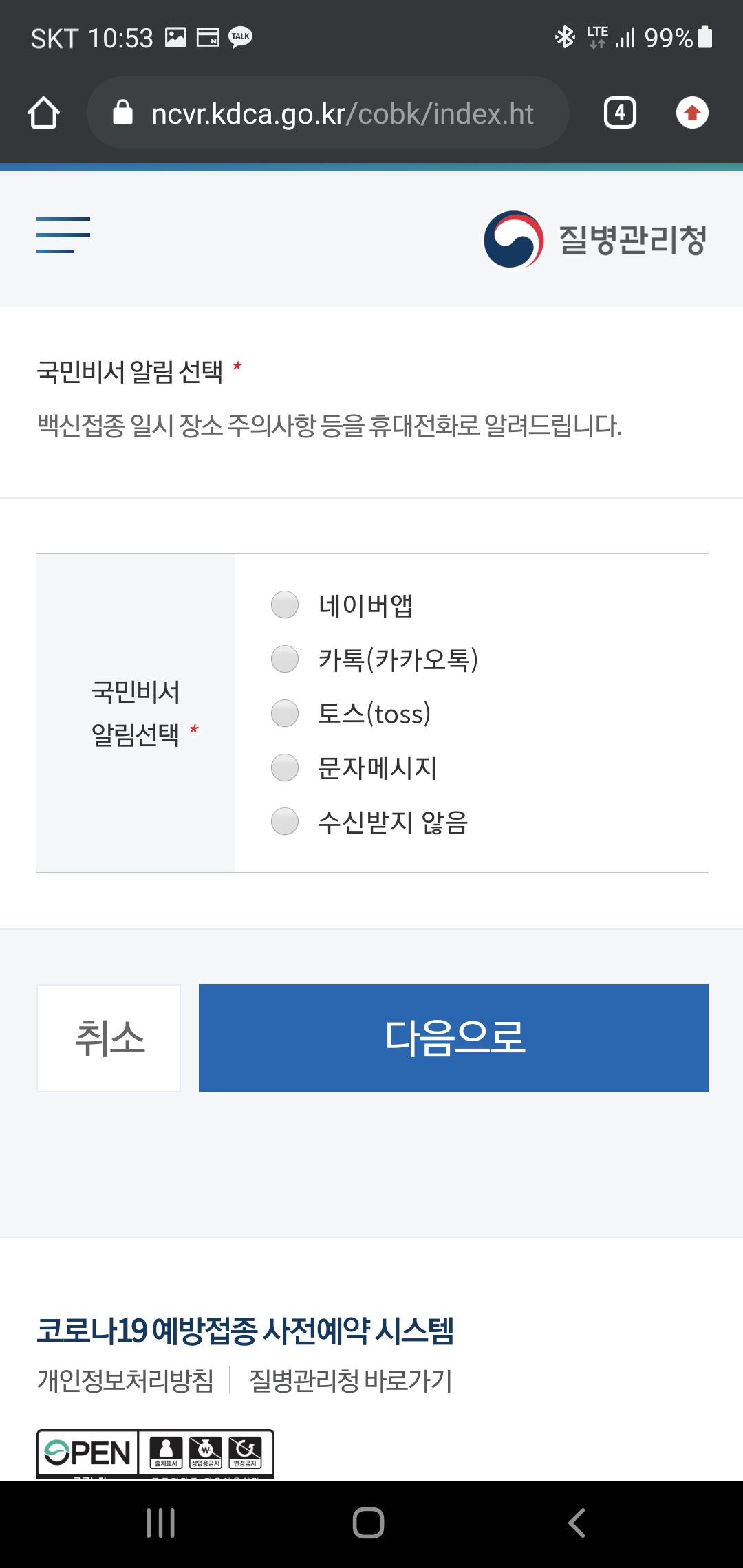 백신 접종과 관련된 예약, 일정, 순서, 위치 등의 정보를 수신받을 알림 앱을 정하는 부분인데 저는 그냥 간편하게 카카오톡을 선택하였습니다.