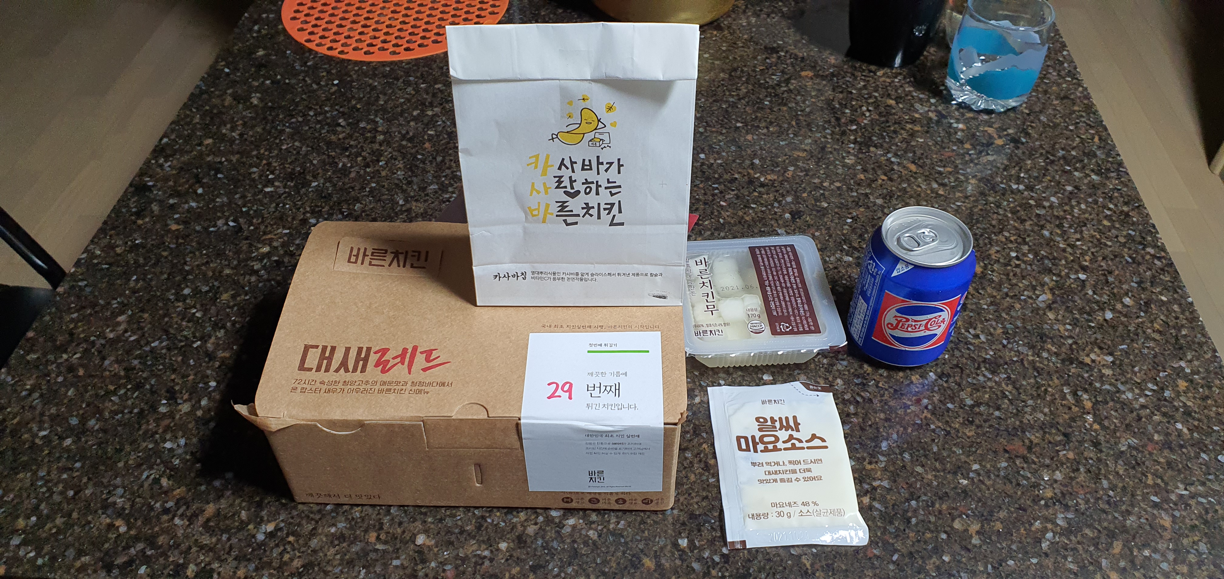 치킨 본품, 치킨무, 살짝 매운맛이 있는듯한 마요 소스, 코크 아닌 펩시, 포카칩 아닌 카사바칩입니다.