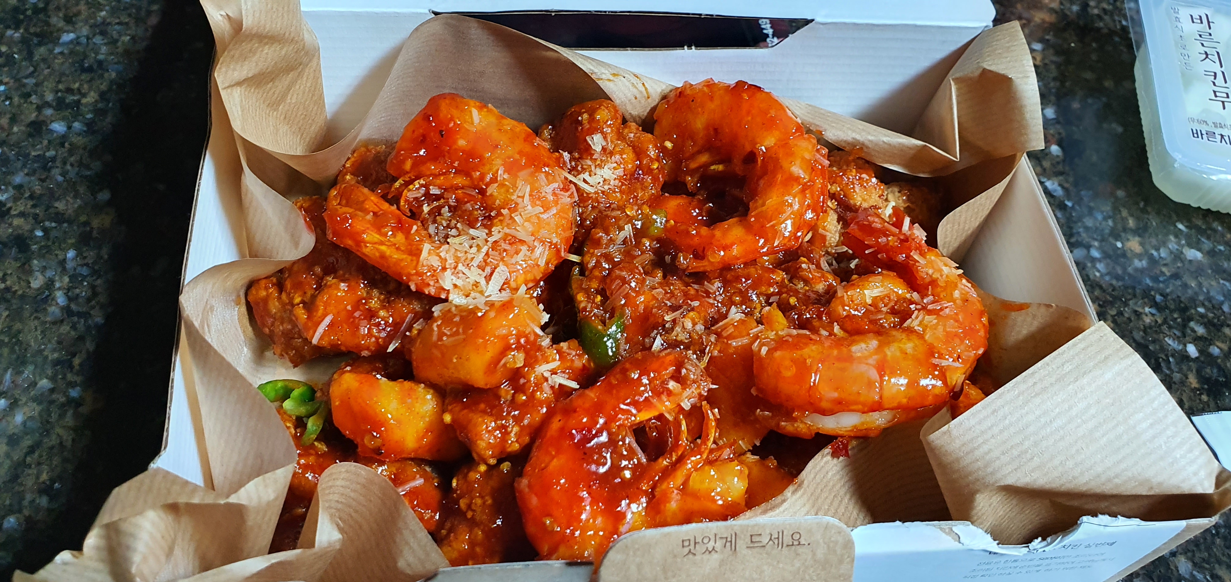치킨도 정말 맛있고 새우도 정말 맛있고 그리고 저는 개인적으로 매운걸 좀 먹는 편이긴 한데 저한테는 매운편 이었습니다. 제 동생은 매운걸 그래도 먹는편이긴 한데 동생은 멀쩡하니 잘만 먹는 거 보니까 매운 거 좀 드시는 분들한테는 별거 아닐 듯합니다.