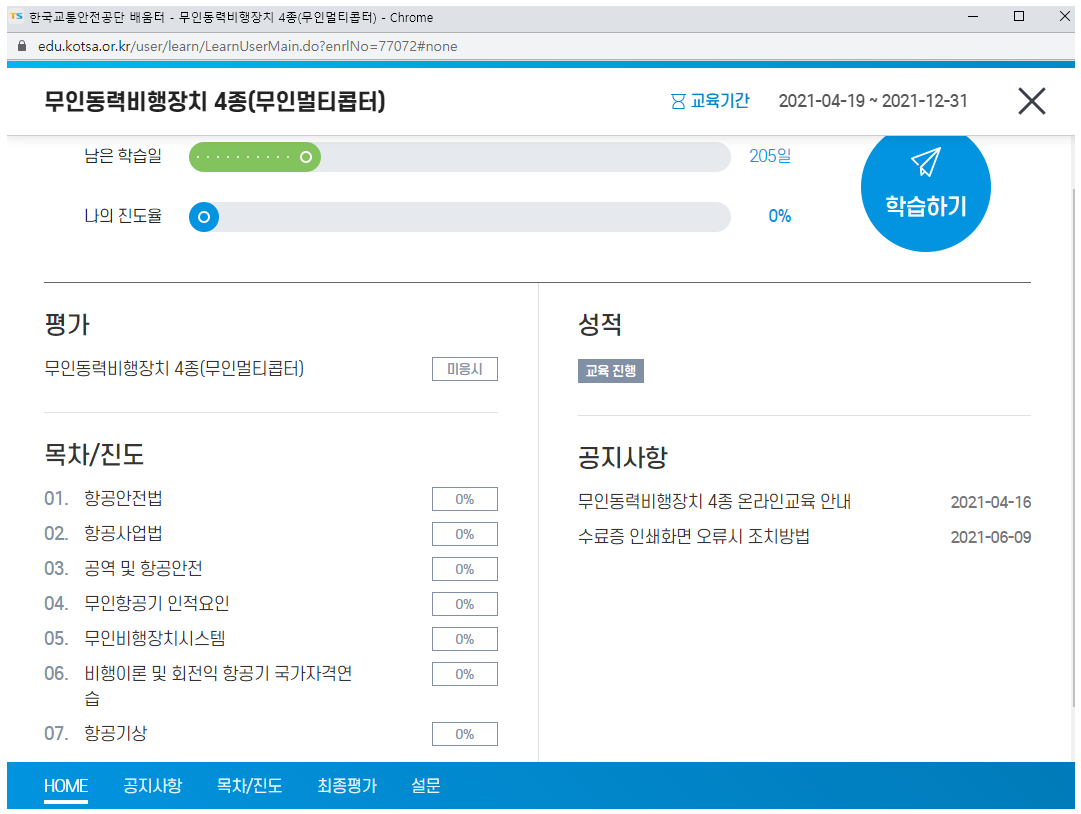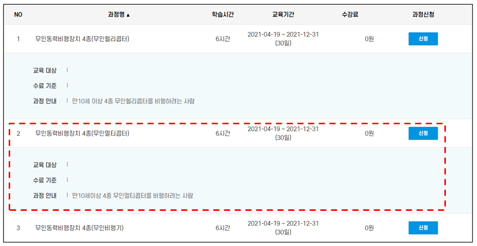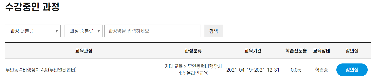 회원가입을 진행하신 후에 수강신청란에 들어가시게 되면 "무인동력비행장치 4종(무인 멀티콥터)"라는 과정을 신청하셔서 진행하시면 됩니다.