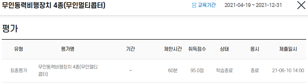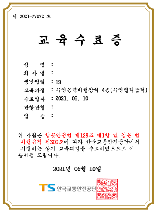 이렇게 수료증을 발부 받음으로써 저는 법적으로 이륙 최대 중량 2kg 이하의 드론을 날릴 수 있는 자격을 획득하였습니다.