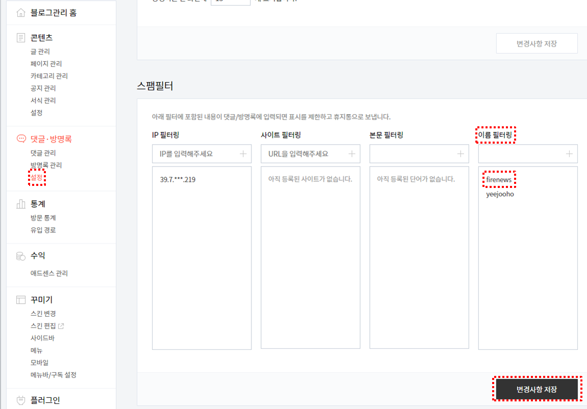▶광고성 댓글 차단 방식 중 "이름 필터링"으로 차단하기