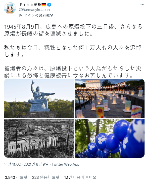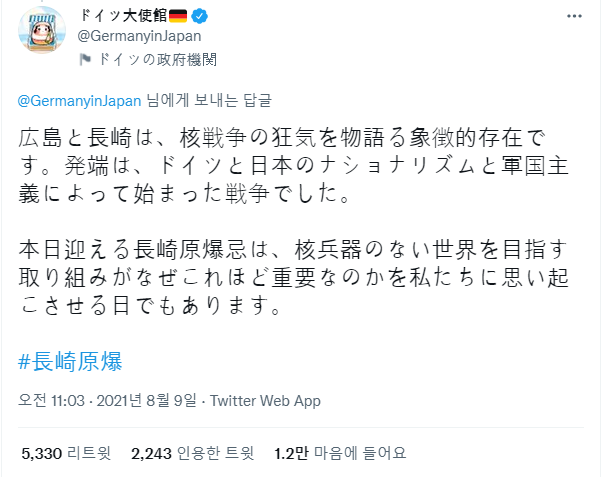 그리고 올해인 2021년 8월 9일 주일본 독일대사관의 공식 트위터 계정에 위와 같은 트윗이 하나 올라옵니다.