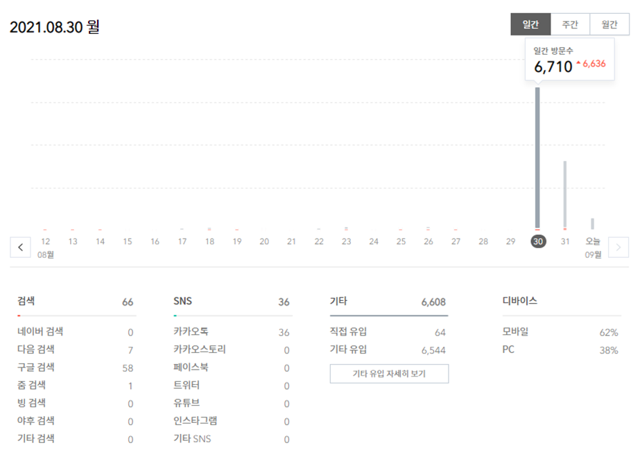 다음 포털 메인 노출이 8월 30일에 발생했는데 그날만 저렇게 보시다시피 6,710명씩이나 방문을 하여 주셨습니다.