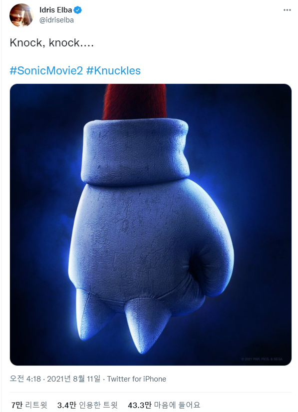 국내에서는 영화 퍼시픽 림(Pacific Rim : 2013년 작)과 토르(Thor : 2011, 2013, 2015, 2017년 작)등을 통해서 잘 알려진 "Idris Elba" 배우분께서 이번 소닉 더 헤지혹 2 무비 버전에서 "너클즈 더 에키드나(Knuckles the Echidna)"의 역할을 맡은 것으로 확인되는 정보로 보이는 너클즈의 주먹을 본인의 트위터 계정에 올리기도 했습니다.