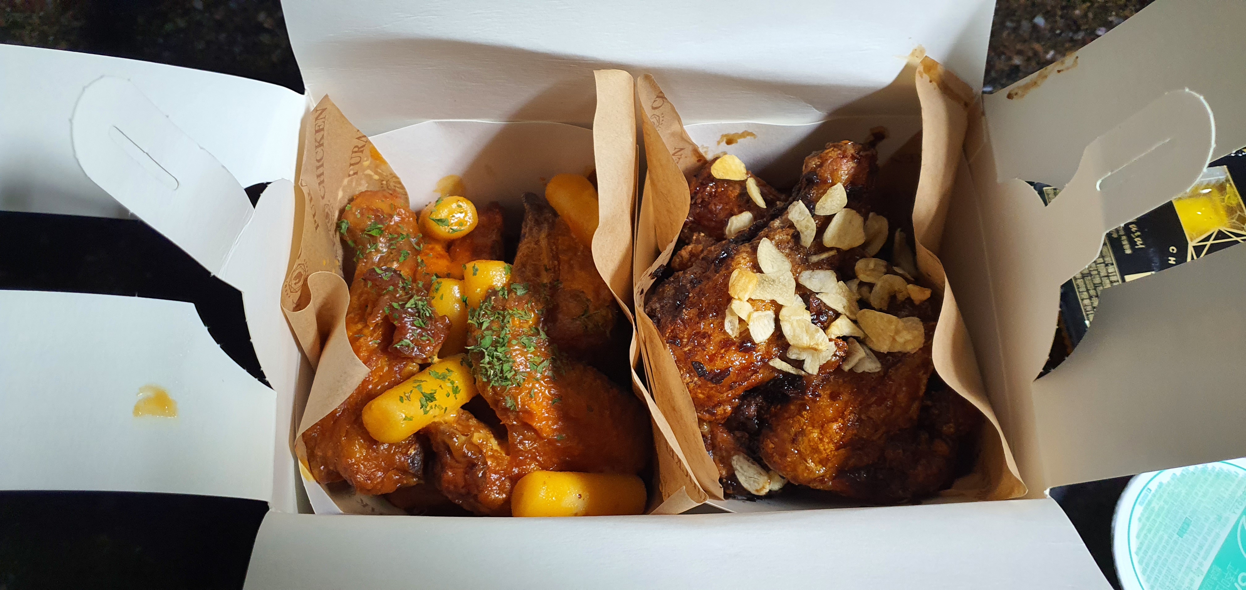사실 비주얼은 둘째 치고라도 이 두 치킨에서 풍겨오는 음식의 냄새가 아주 강렬해서 사실 포장 뜯을 때부터 입안에는 침이 흥건하게 고이게 되죠.