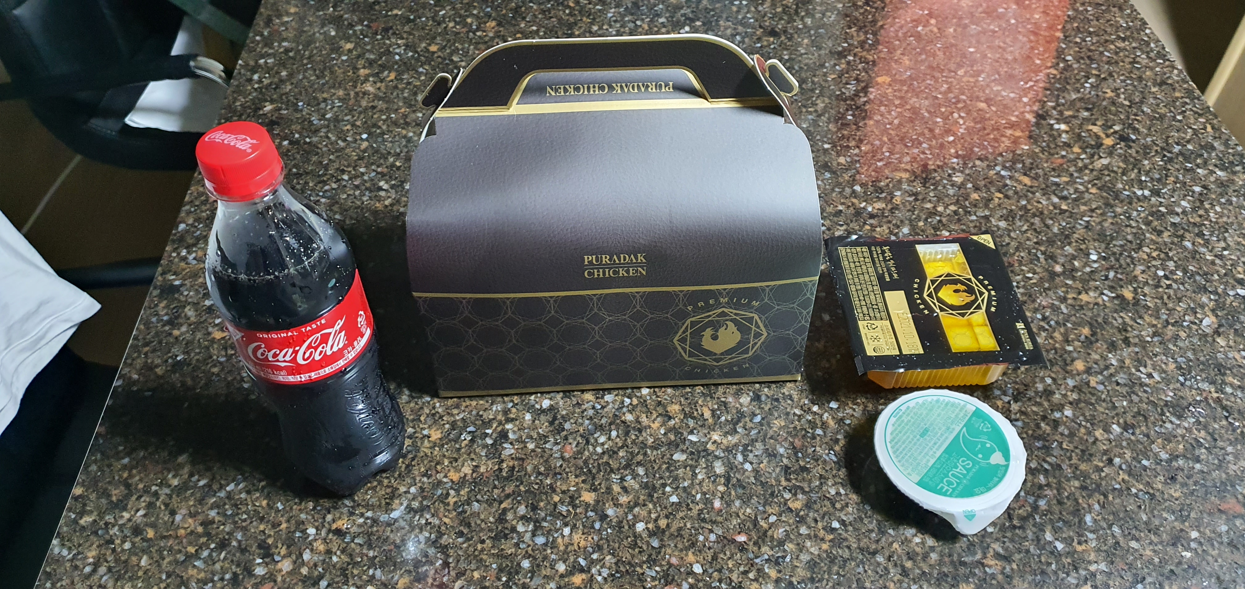 구성품은 블랙 투움바 본체(?)와 코카콜라 500ml 한병, 단무지, 그리고 푸라닭 특제 청양 마요네즈 소스입니다.