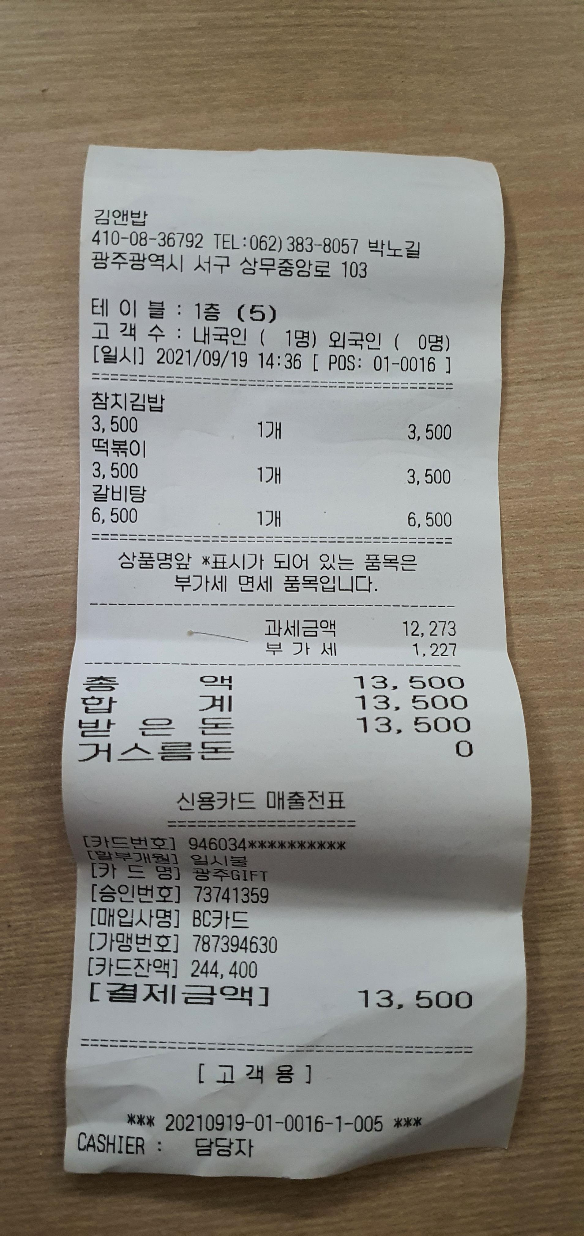 어느 분식집에 가서도 볼 수 있는 평범한 참치김밥(3,500원)입니다.