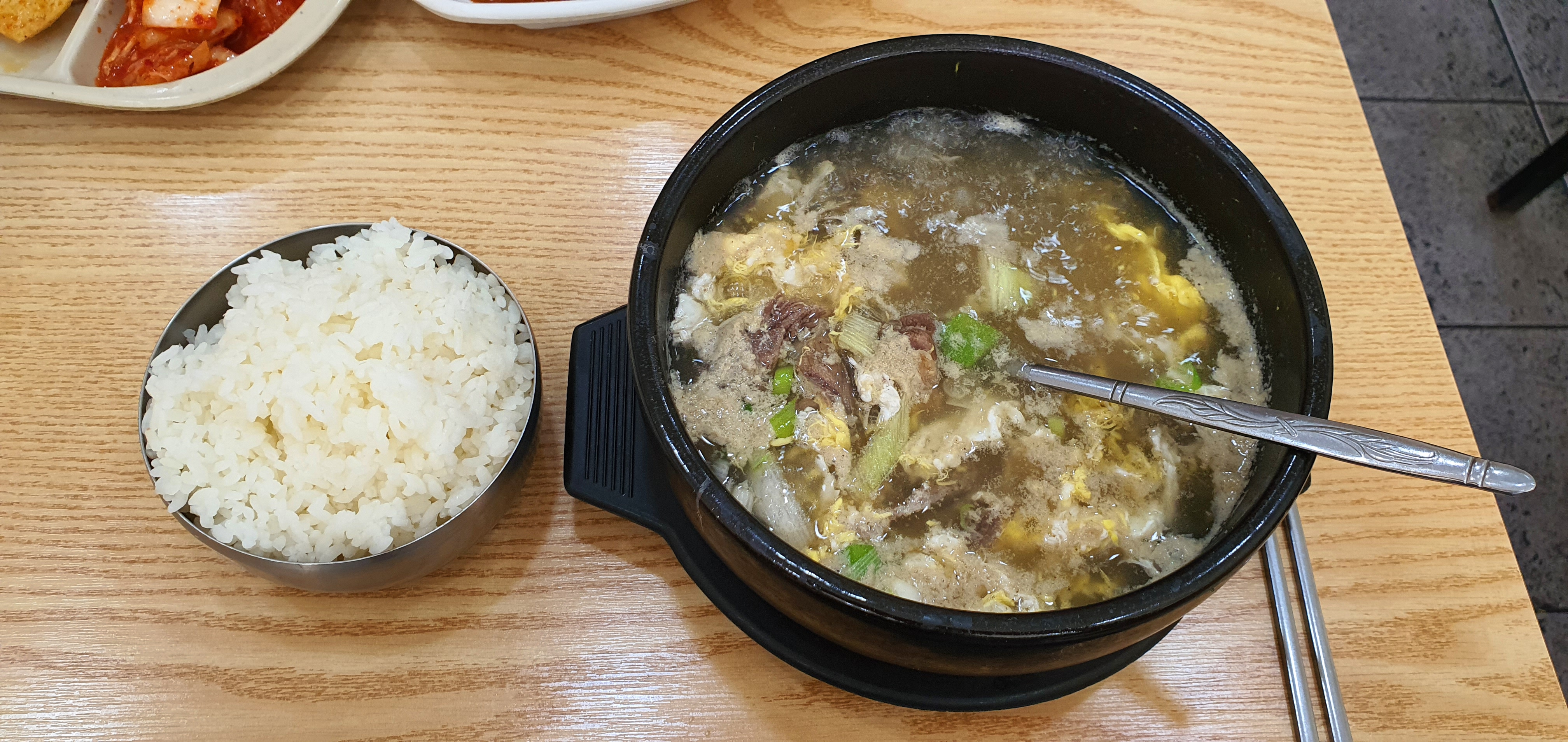 갈비탕엔 조그만 뼈가 3개 있었고 얇은 고기 여러 점이 들어있었으면서 갈비탕 하면 빠질 수 없는 당면이 들어가 있었습니다. 살짝 짭조름한 국물 베이스인데 계란이 풀려 있어서 그런지 목 넘김은 정말 좋았습니다.