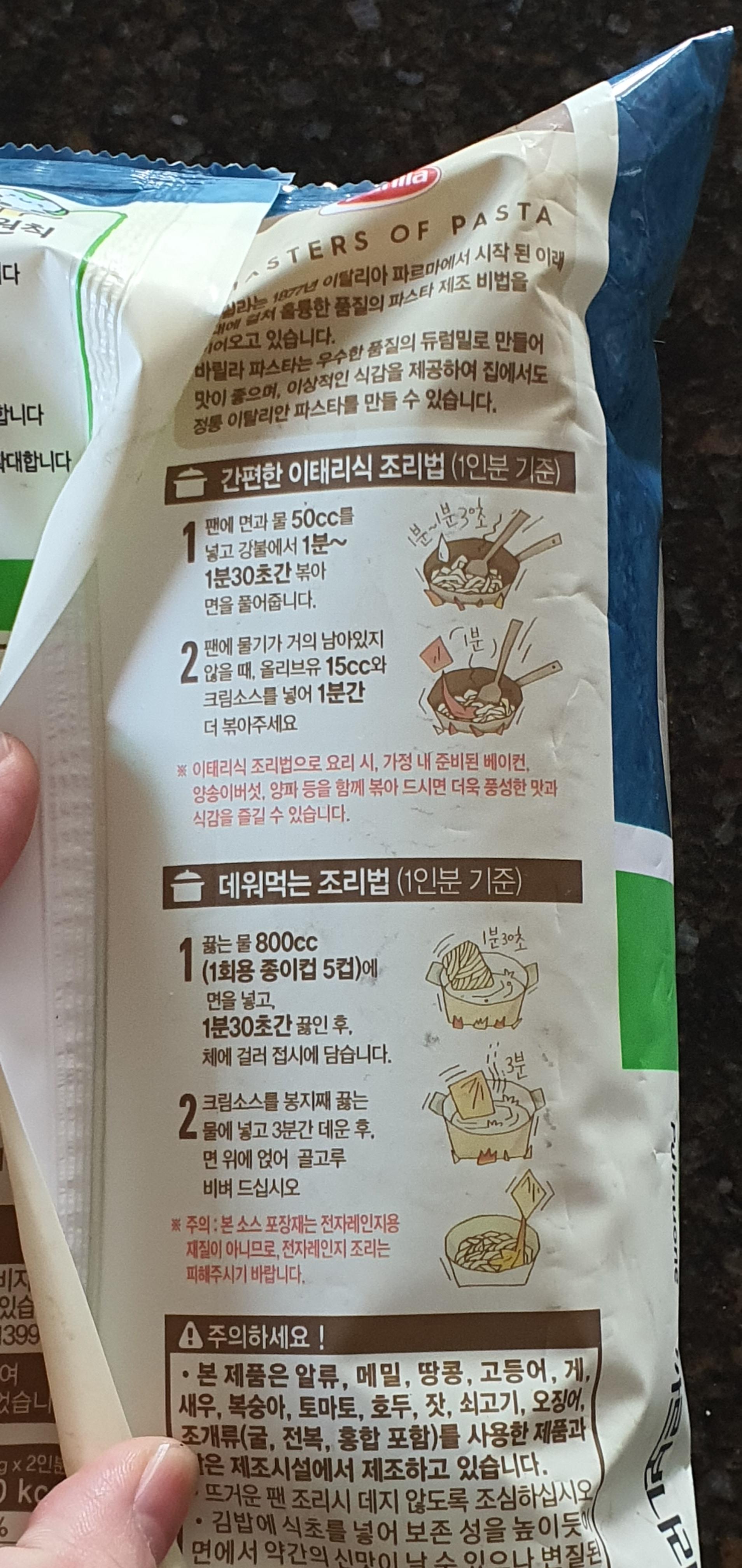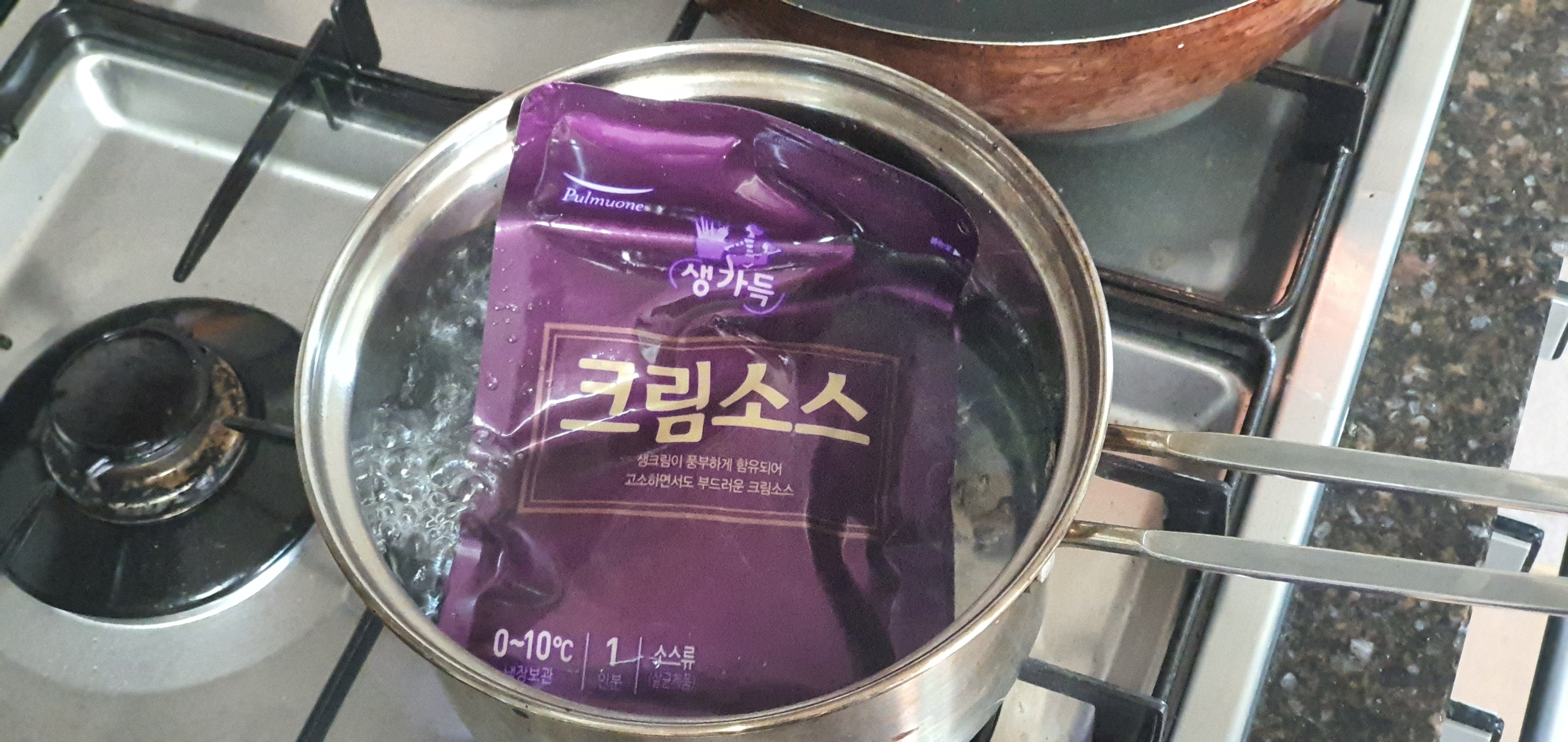 조리법대로라면 끓는 물 기준으로 파스타면은 1분 30초, 크림소스는 3분입니다.