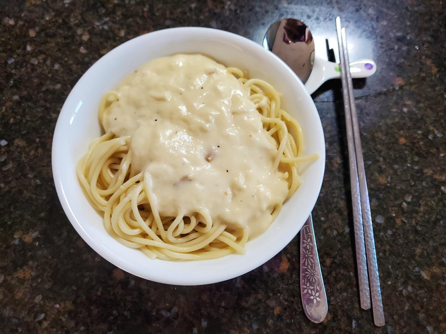 저는 면이 뜨거운데 뜨거운 크림소스를 부으면 면이 쉽게 불어버릴까 봐 일부러 살짝 차가운 물에 식혀 줬는데 오히려 면이 흐물흐물 해져버리는 역효과를 가져와 버려서 여러분은 꼭 조리법대로 하시길 바랍니다 ㅠㅠ.