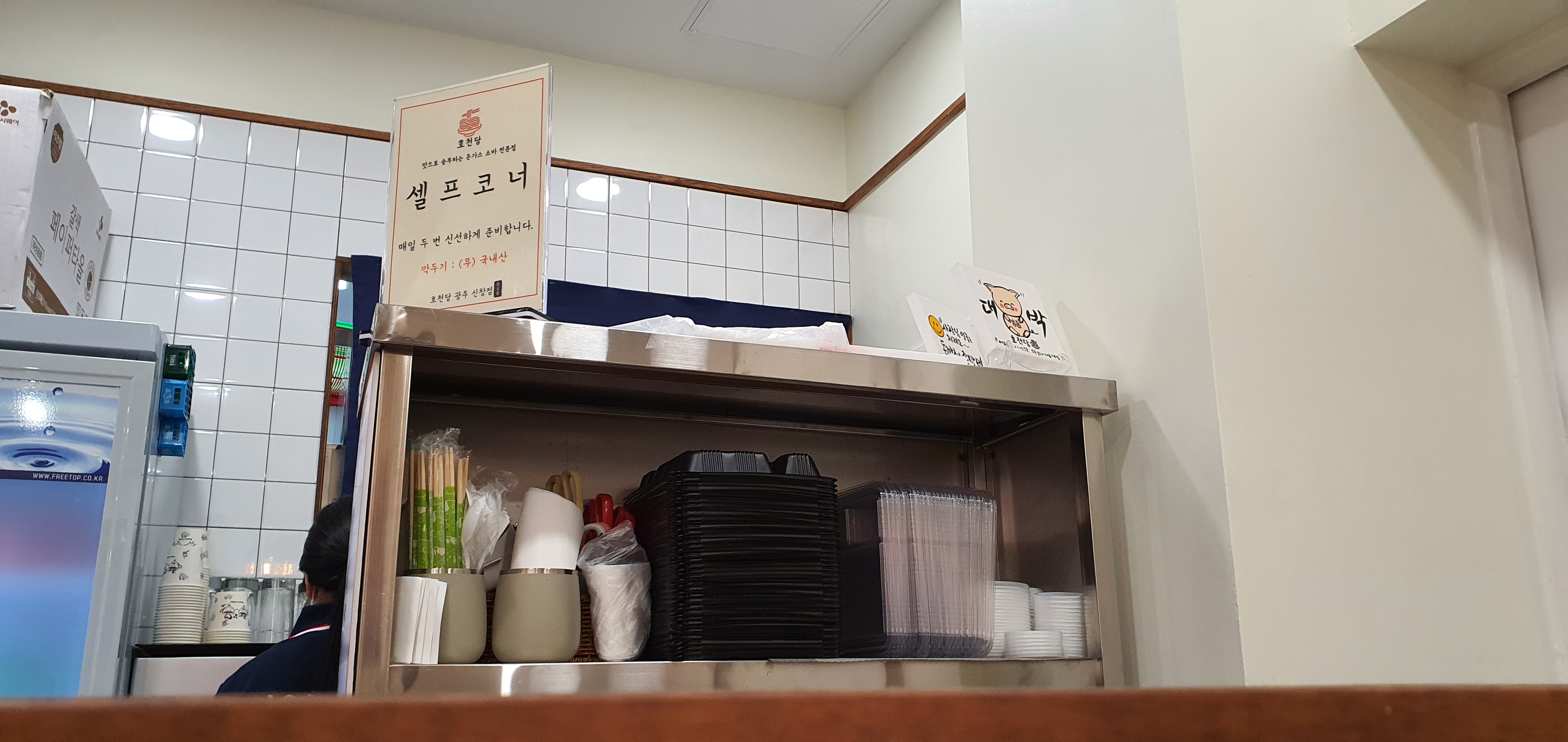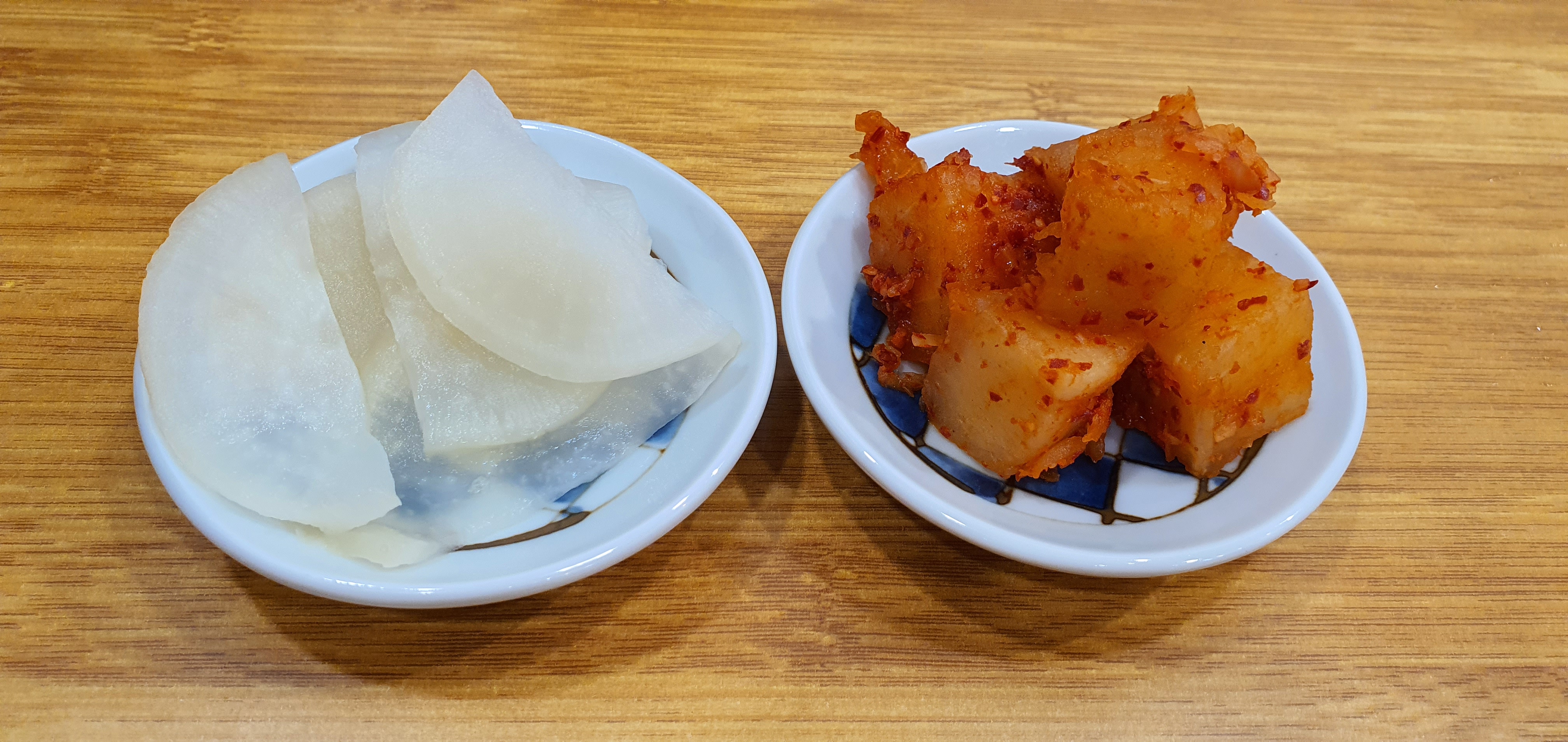 가게 안쪽에 잘 보이게 셀프 코너가 있어서 가보니 단무지랑 깍두기를 셀프로 마음 가는 대로 양껏 가져다 먹을 수 있었습니다.