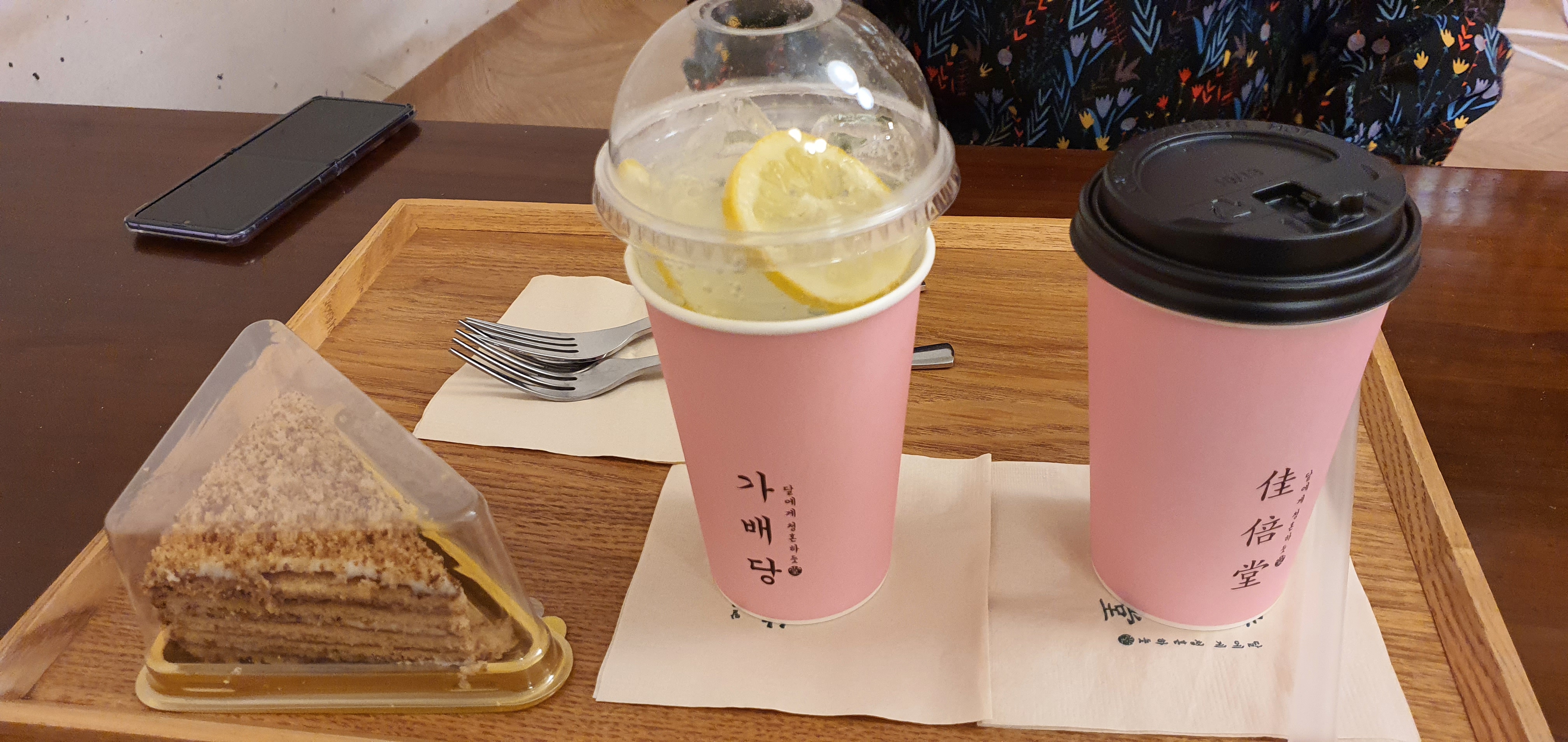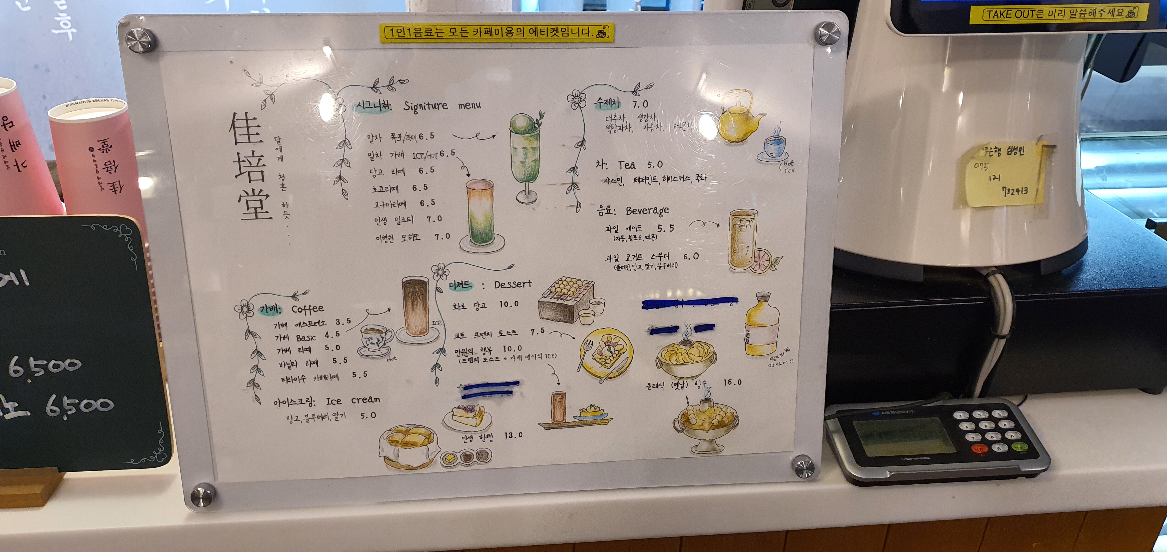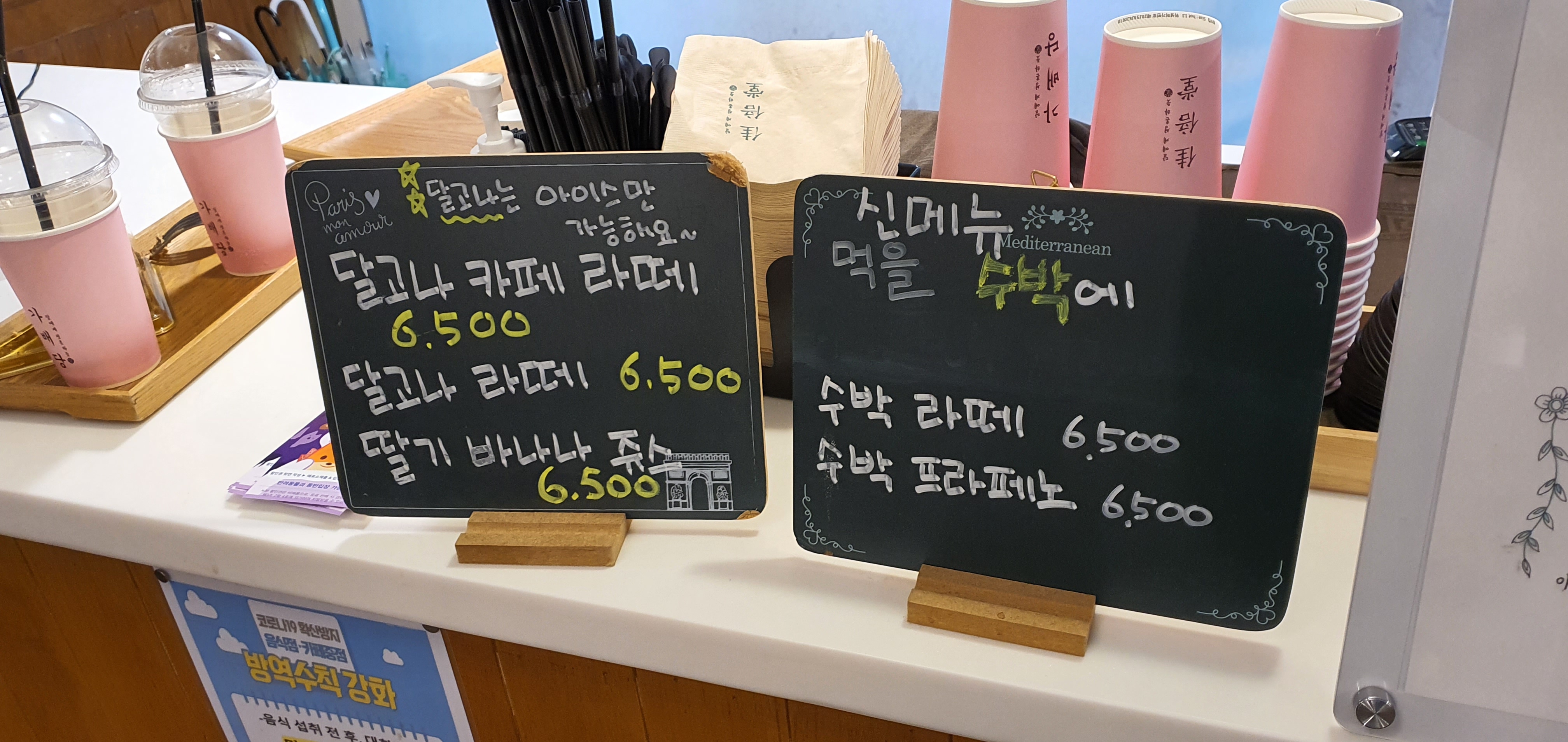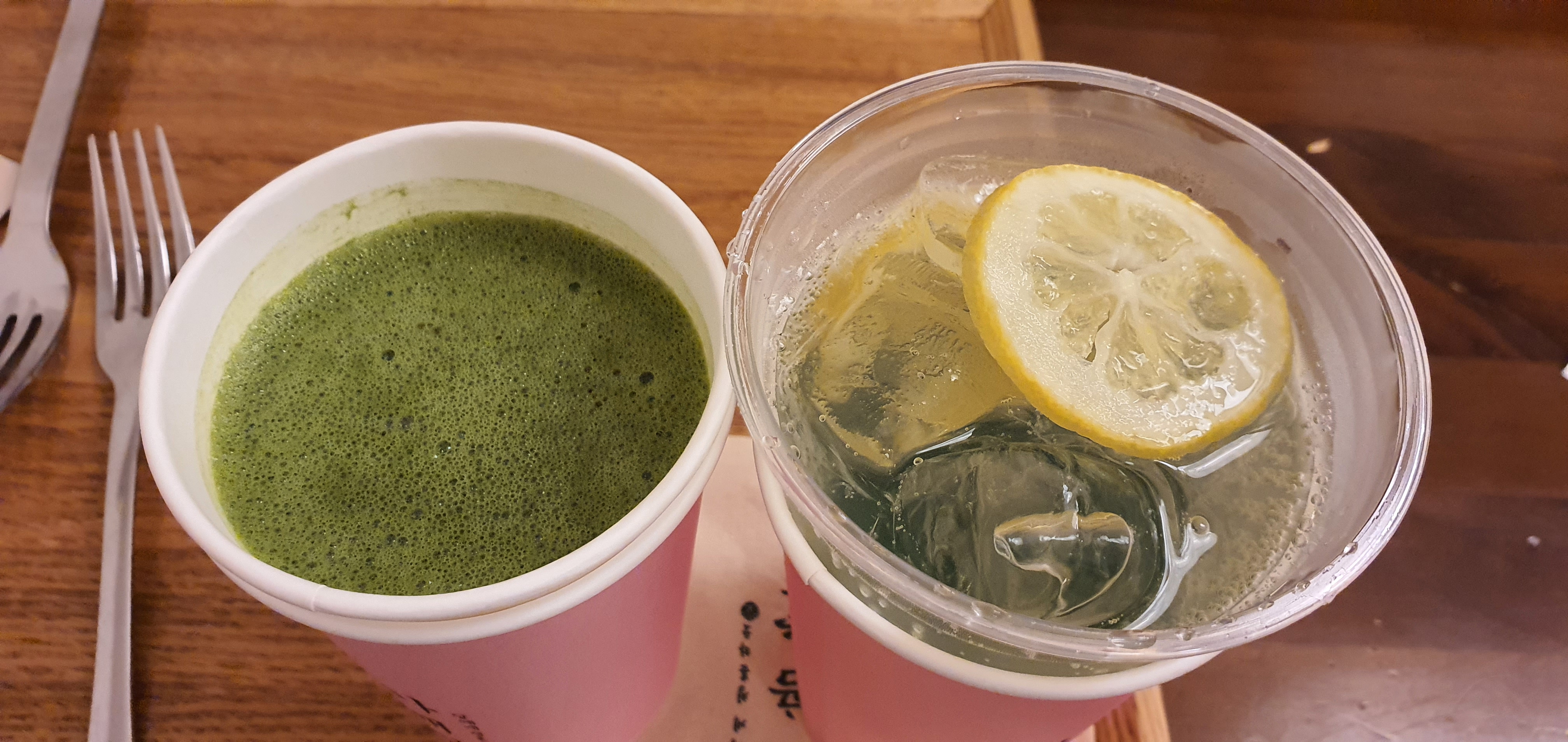 왼쪽부터 레몬말렌카 6,500원, 이병헌 모히또 7,000원, 그리고 말차라떼 6,500원입니다.