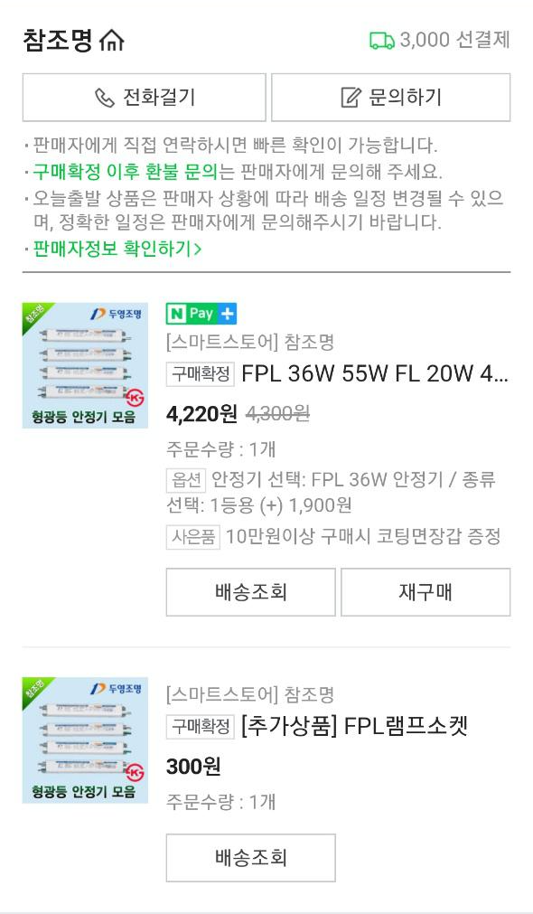 문제가 되는 안정기 제품명과 동일한 제품군을 찾아보니 네이버에 있어서 주문했습니다.