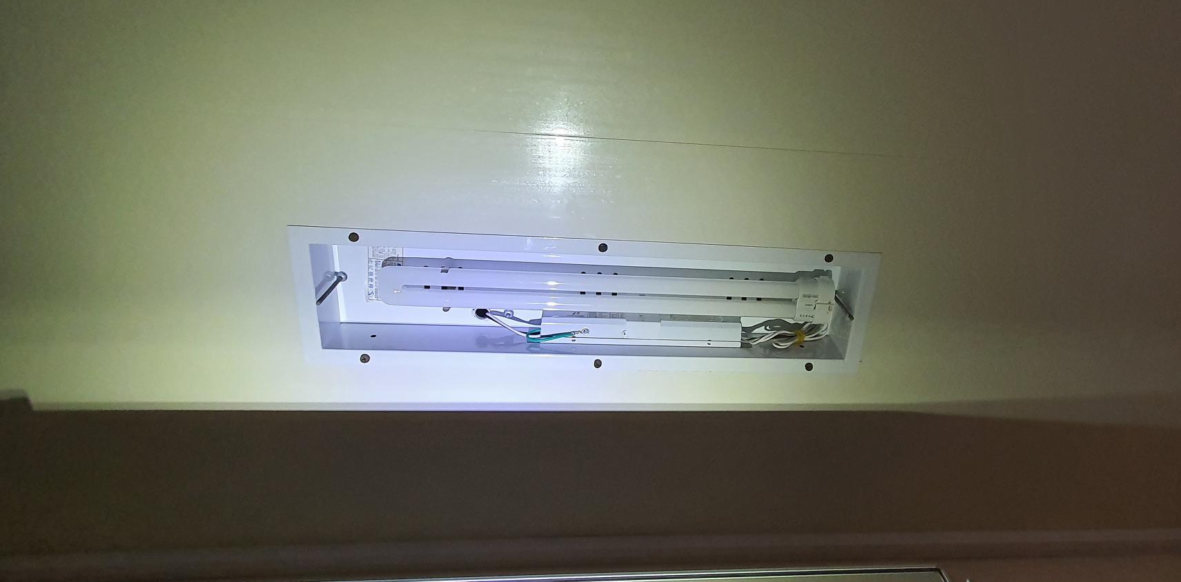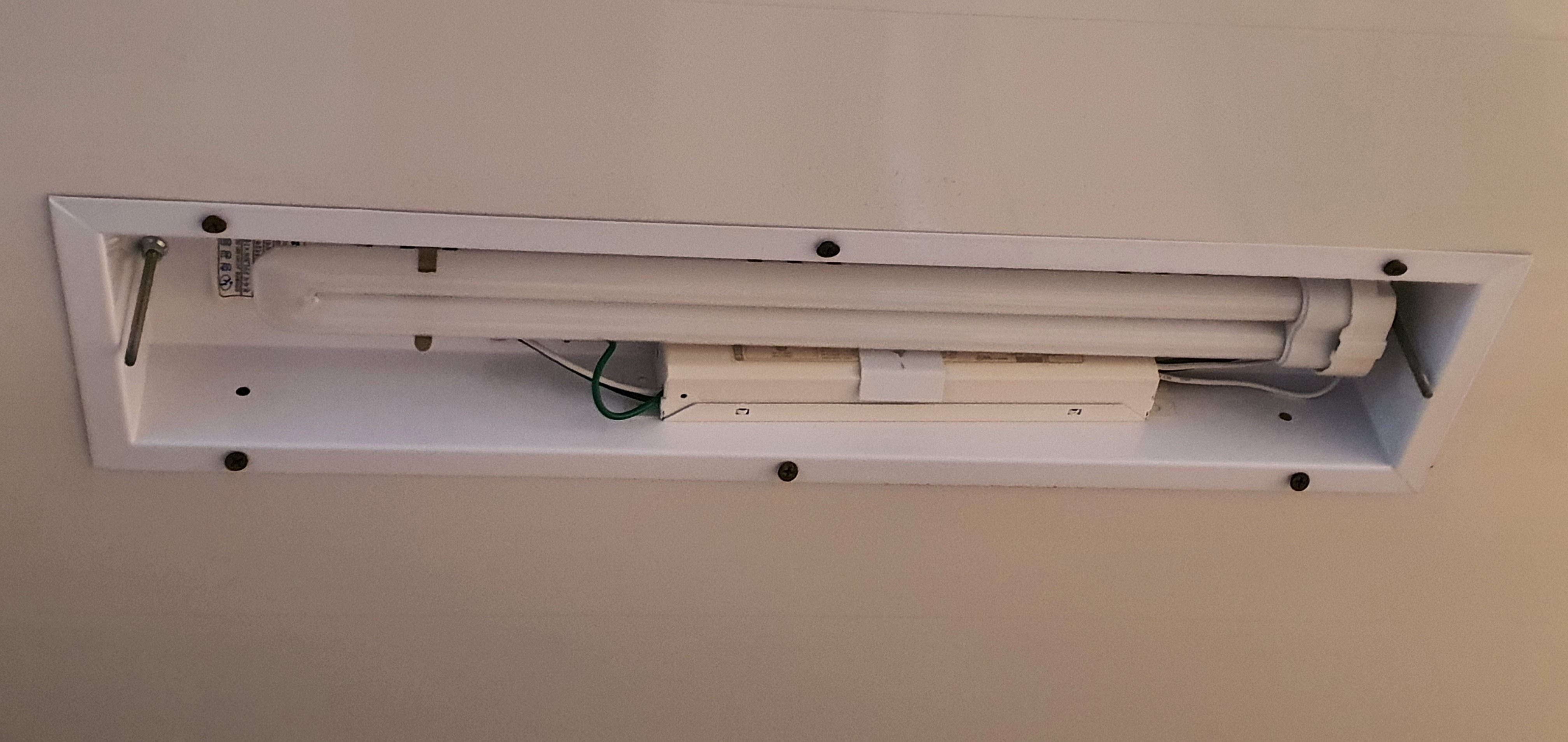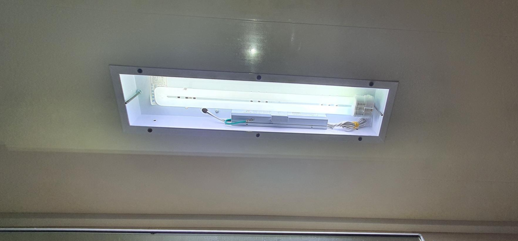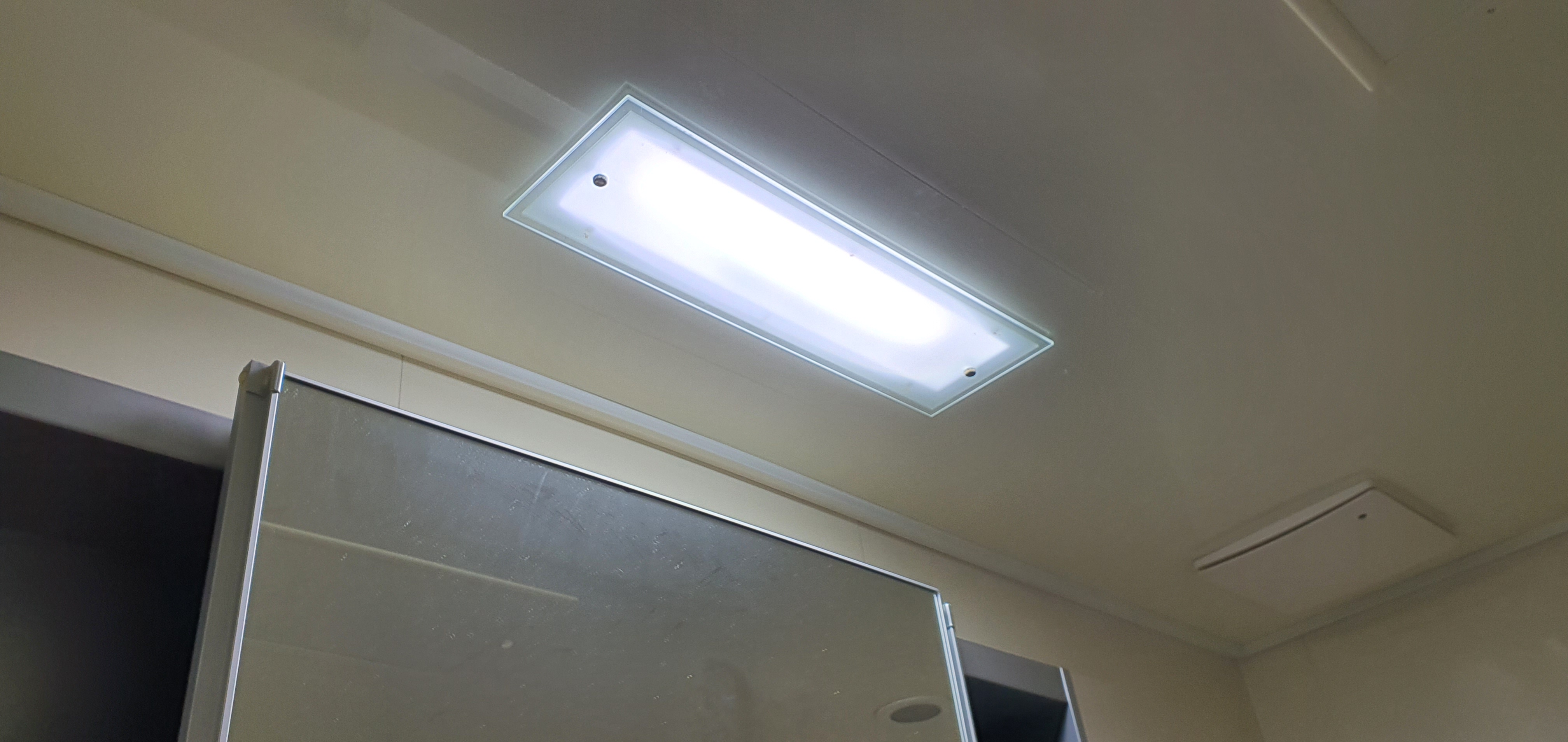 재조립이 완료된 형광등 트레이 세트를 원래 탈거를 했던 화장실 조명 위치에 다시 볼트로 고정하고 전원선을 연결해 준 뒤 전등 차단기를 다시 올려주고 형광등이 잘 작동되나 테스트를 위해 스위치를 켜 보았습니다.