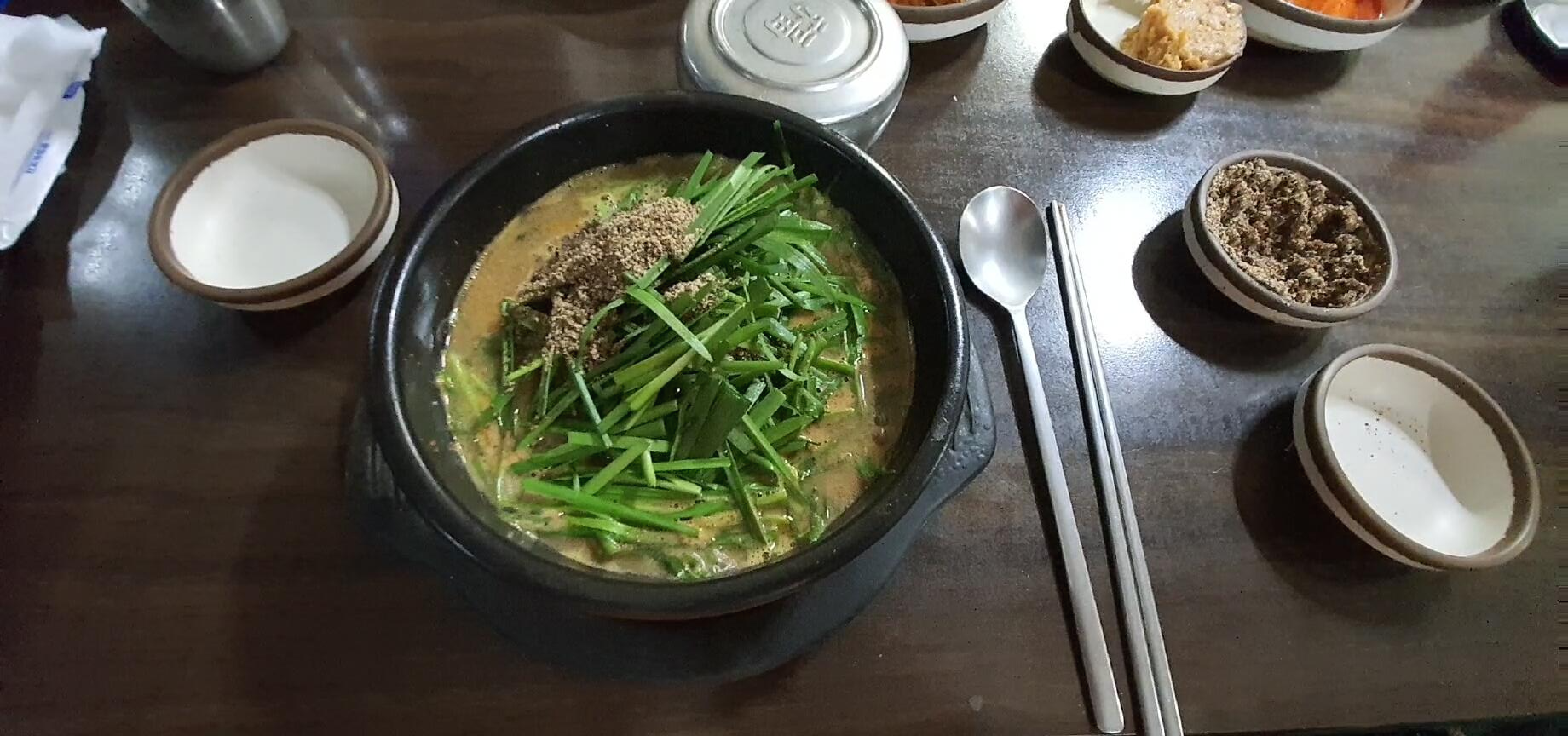 보시는 바와 같이 부추 한가득에 들깨가루가 엄청 들어가 있어서 약간 오리탕 같이 걸쭉하게 먹는 게 포인트입니다.
