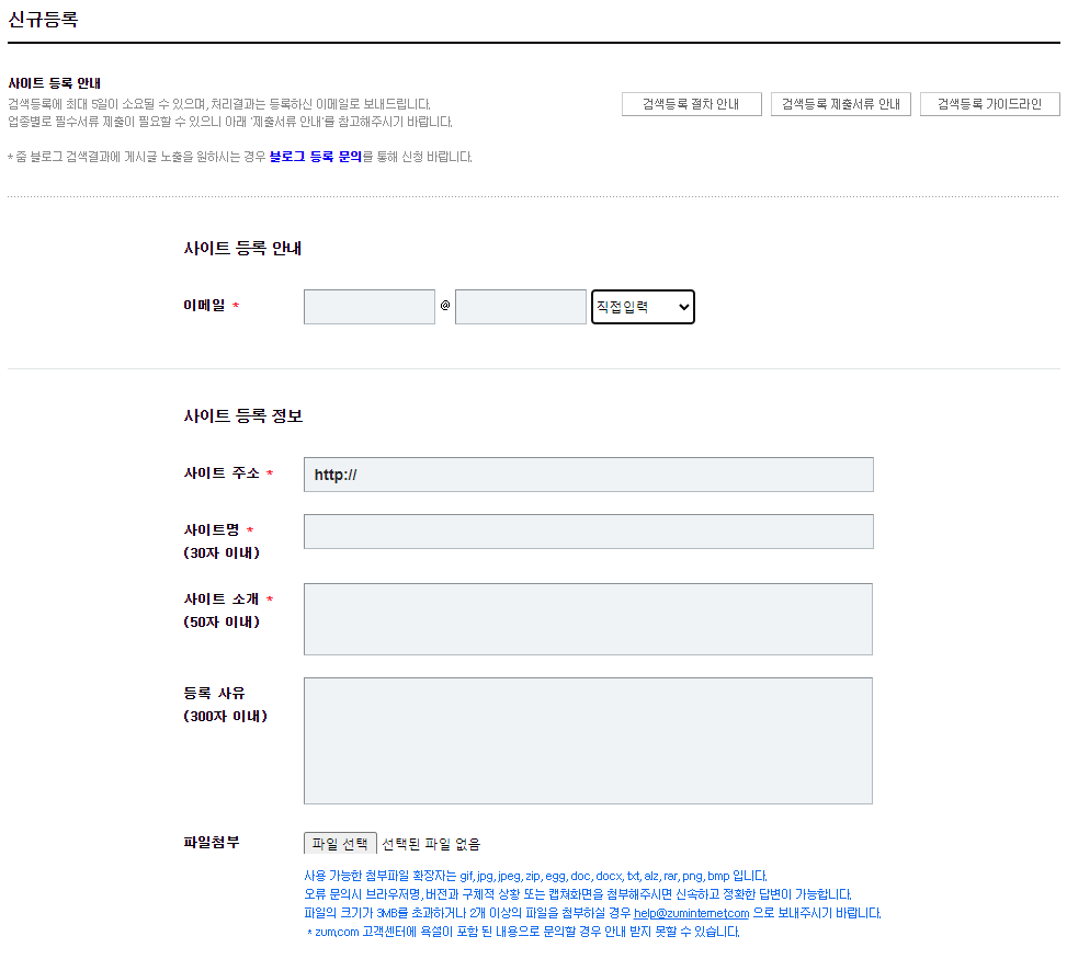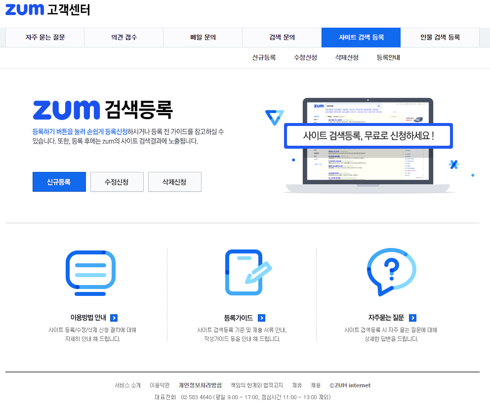 링크를 타고 들어가면 ZUM 검색등록을 시작할 수 있으며, "신규등록" 버튼을 눌러서 절차를 밟을 수 있습니다.