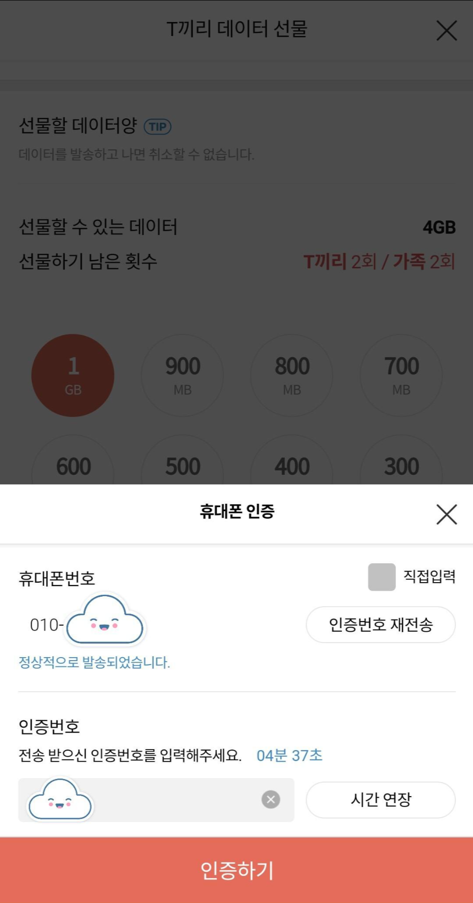 2. 선물받는 사람의 번호를 기입 후, 선물하고자 하는 데이터의 양을 선택해 줍시다.