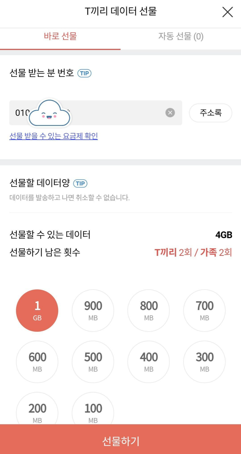 ※ 같은 SKT 사용자끼리는 월 2회까지만 가능 하며 선물할 수 있는 데이터의 양은 제한되어 있습니다.