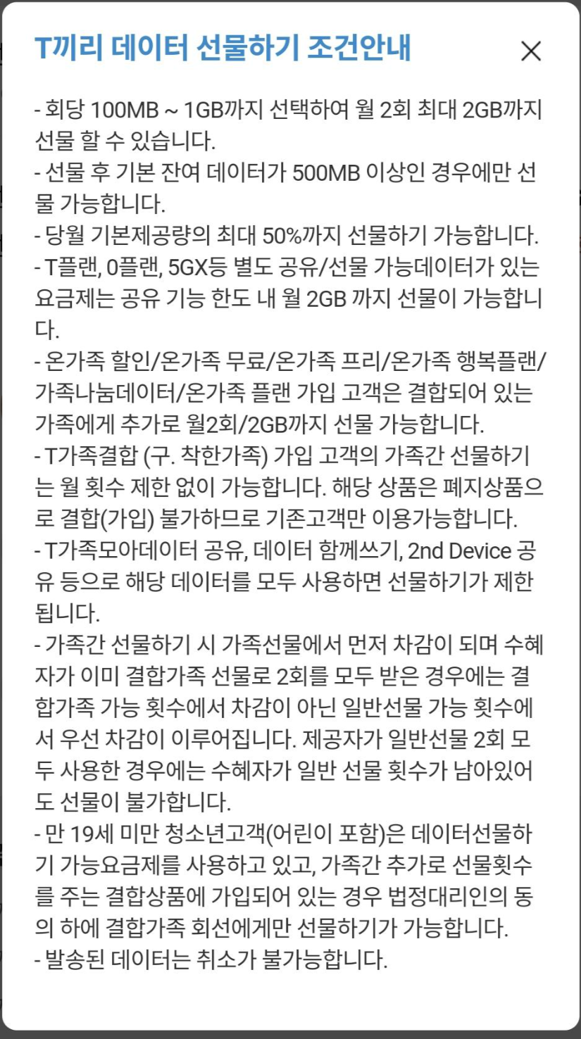 ※ 예전에는 가족끼리 간에는 데이터를 무제한으로 선물하는 요금제(T가족 결합)가 존재했었지만 현재는 해당 상품이 폐지되어 기존에 가입한 고객들만 이용이 가능한 부분이었습니다.