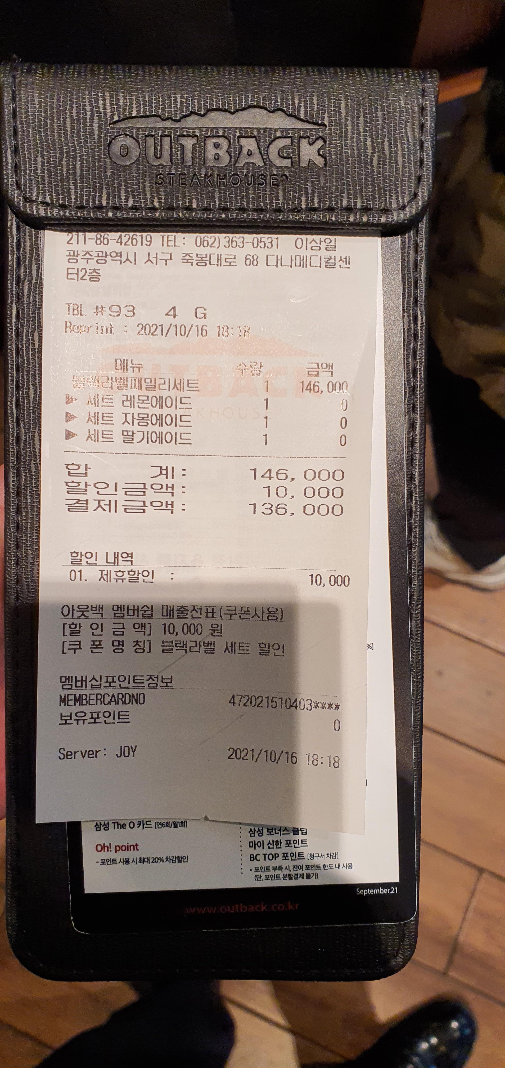 원래 블랙라벨 패밀리 세트의 가격은 146,000원인데 부시 브레드를 봉투 포장하여서 50원이 추가되어 146,050원이 청구되었는데, 저희가 지인을 통해 선물로 받았던 5만 원권 할인 쿠폰을 얹어주고 그리고 제가 SKT 멤버십 GOLD 등급이라서 15% 통신사 추가 할인을 청구하고 추가로 아웃백 스테이크 하우스 멤버십 가입을 해서 받을 수 있는 부메랑 생일 쿠폰 할인으로 1만 원 할인을 받았습니다.