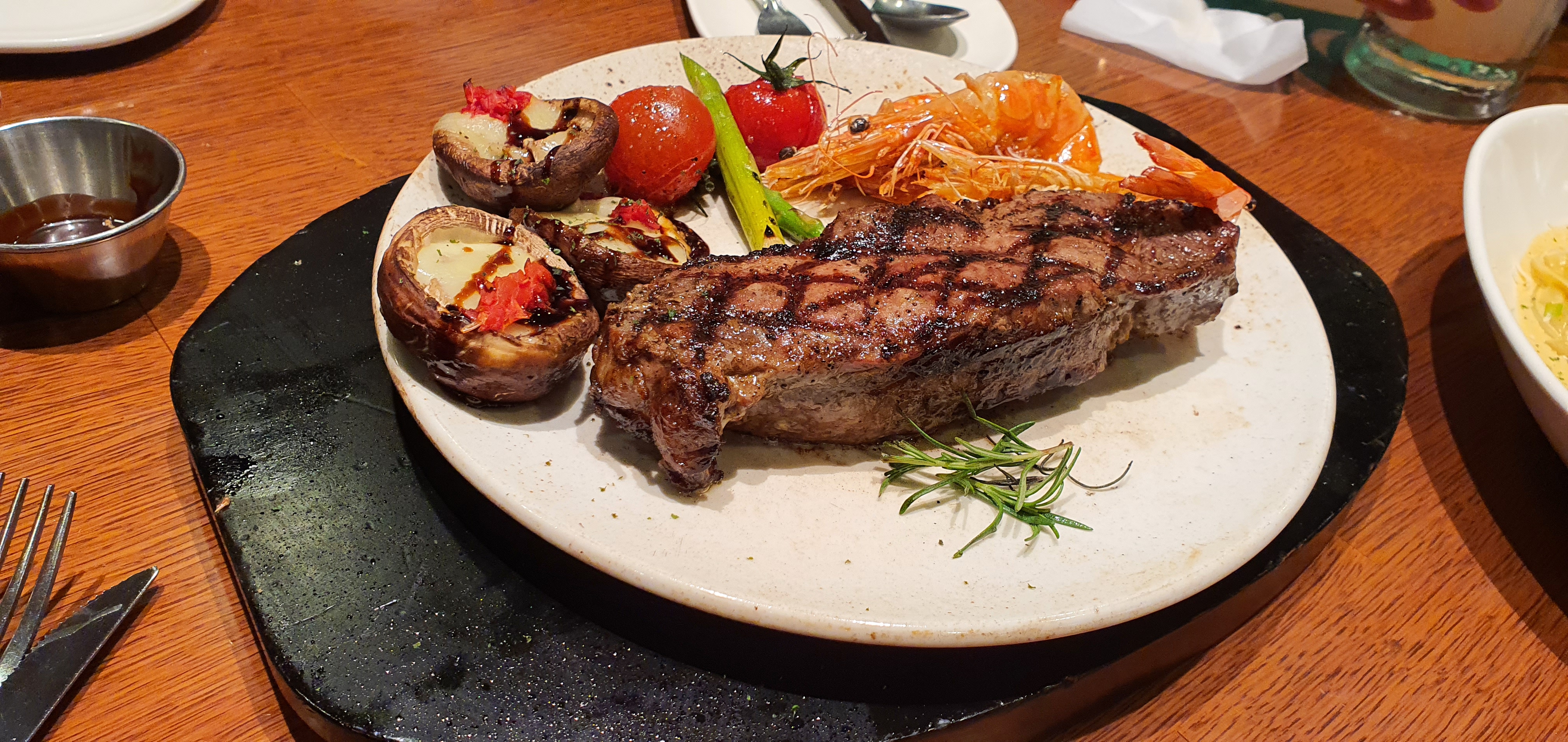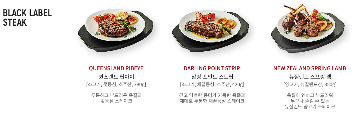 아웃백 스테이크 하우스의 블랙 라벨 스테이크는 총 3종류 중 하나를 선택하면 되는데 퀸즈랜드 립아이(380g), 달링 포인트 스트립(420g), 그리고 뉴질랜드 스프링 램(350g)이 제공되는데 저희는 달링 포인트 스트립으로 선택했습니다.