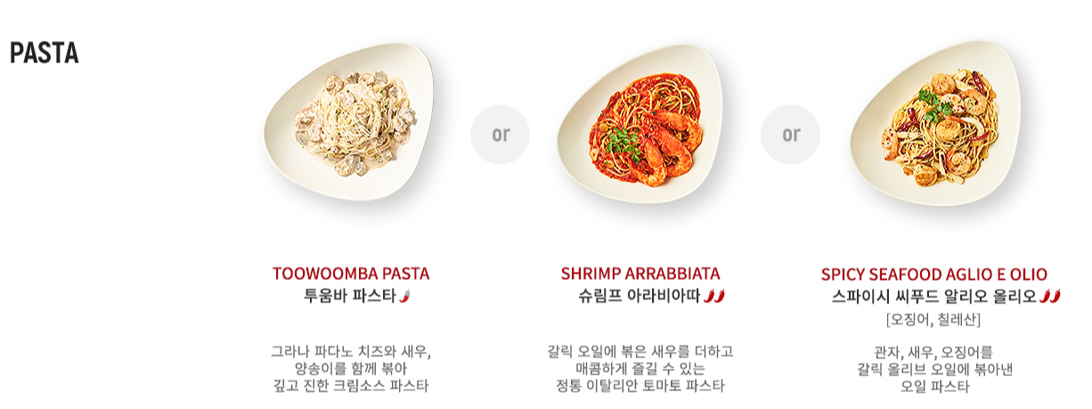 스테이크를 고르고 나면 패밀리 세트답게 두 번째로 제공되는 기본 파스타 3종류인 투움바 파스타, 슈림프 아라비아따, 그리고 스파이시 씨푸드 알리오 올리오 중 하나를 또 선택하면 되는데 저희 부부와 장인 내외분들은 모두 맵 찔이라서 무난한 투움바 파스타를 선택했습니다.
