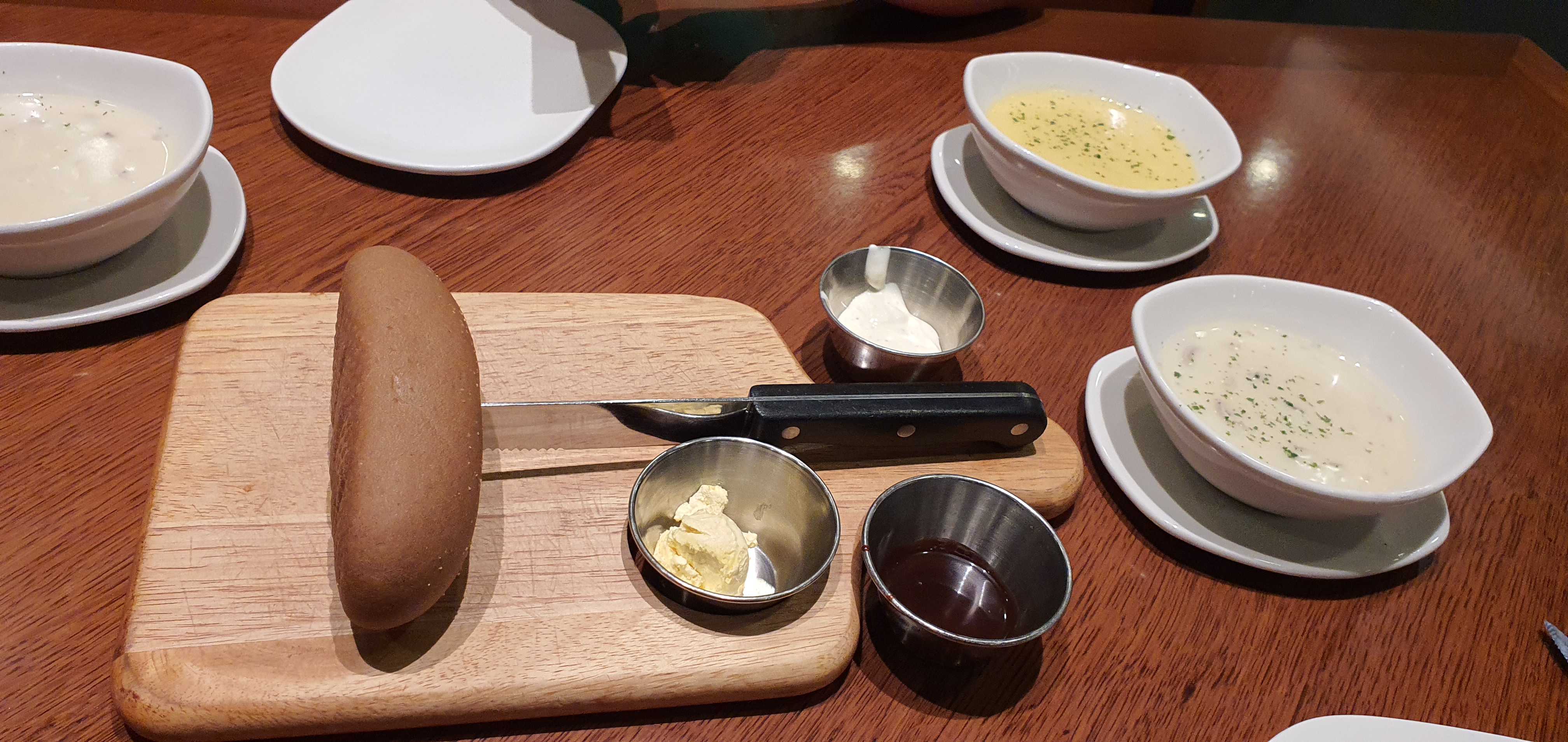식전 애피타이저로 부시맨 브레드와 콘스프와 양송이 스프를 주문해서 받았습니다.