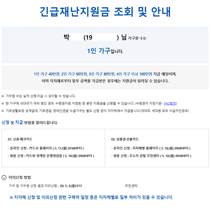 그리하여 본인이 가족 구성원중 "세대주"이면서 지원금을 받을 지원카드의 "본인 명의의 카드"가 있으면 일단 준비는 끝입니다.