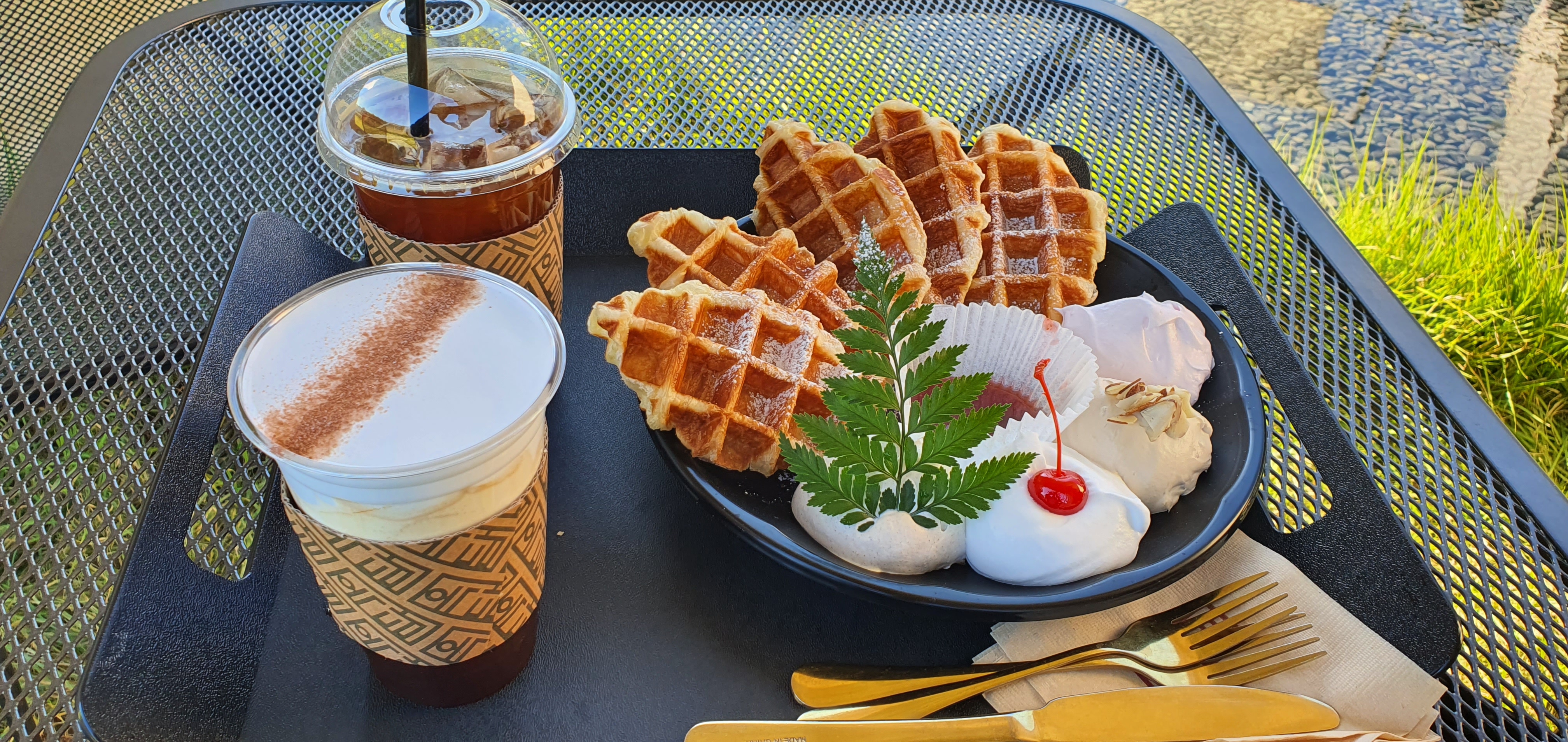 그래서 후식 타임을 즐기기 위해서 크림플과 아이스 아메리카노와 아이스 아인슈페너 하나씩 주문하고 광합성이나 좀 할 겸 밖으로 나가서 시식을 진행하였습니다.