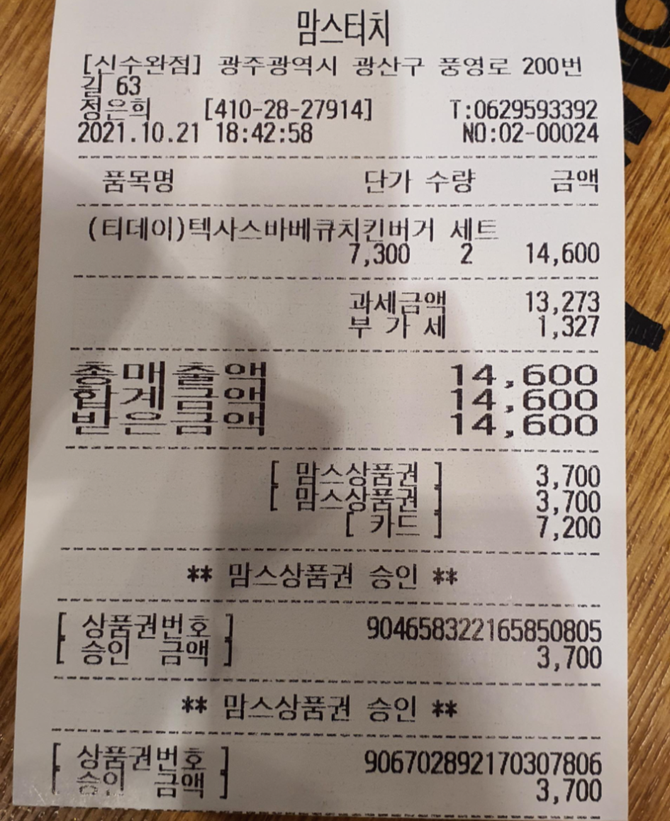 T-day 할인 쿠폰 50% 적용해서 인당 3,700원으로 푸짐한 양의 맘스터치 텍사스바베큐치킨버거 세트를 구매하고 나니까 너무 혜자같이 느껴지네요.
