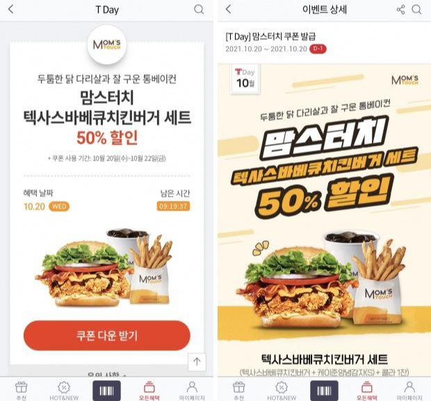 비록 이미 지나긴 했지만 이번 20일까지 SK텔레콤의 T-day "맘스터치 텍사스바베큐치킨버거 세트"가 50% 할인 쿠폰을 다운로드할 수 있어서 냉큼 받아 놨다가 쿠폰 만료일 전에 맘스터치를 방문해서 포장해 왔습니다.