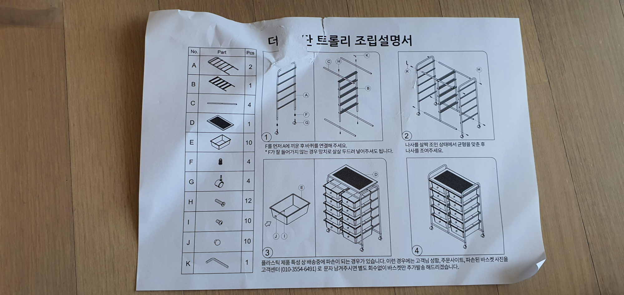 구성품은 상기와 같이 내부 프레임 조립체들과 바구니 함들과 일부 소켓 볼트들 외 조립 설명서가 동봉되어 있습니다.
