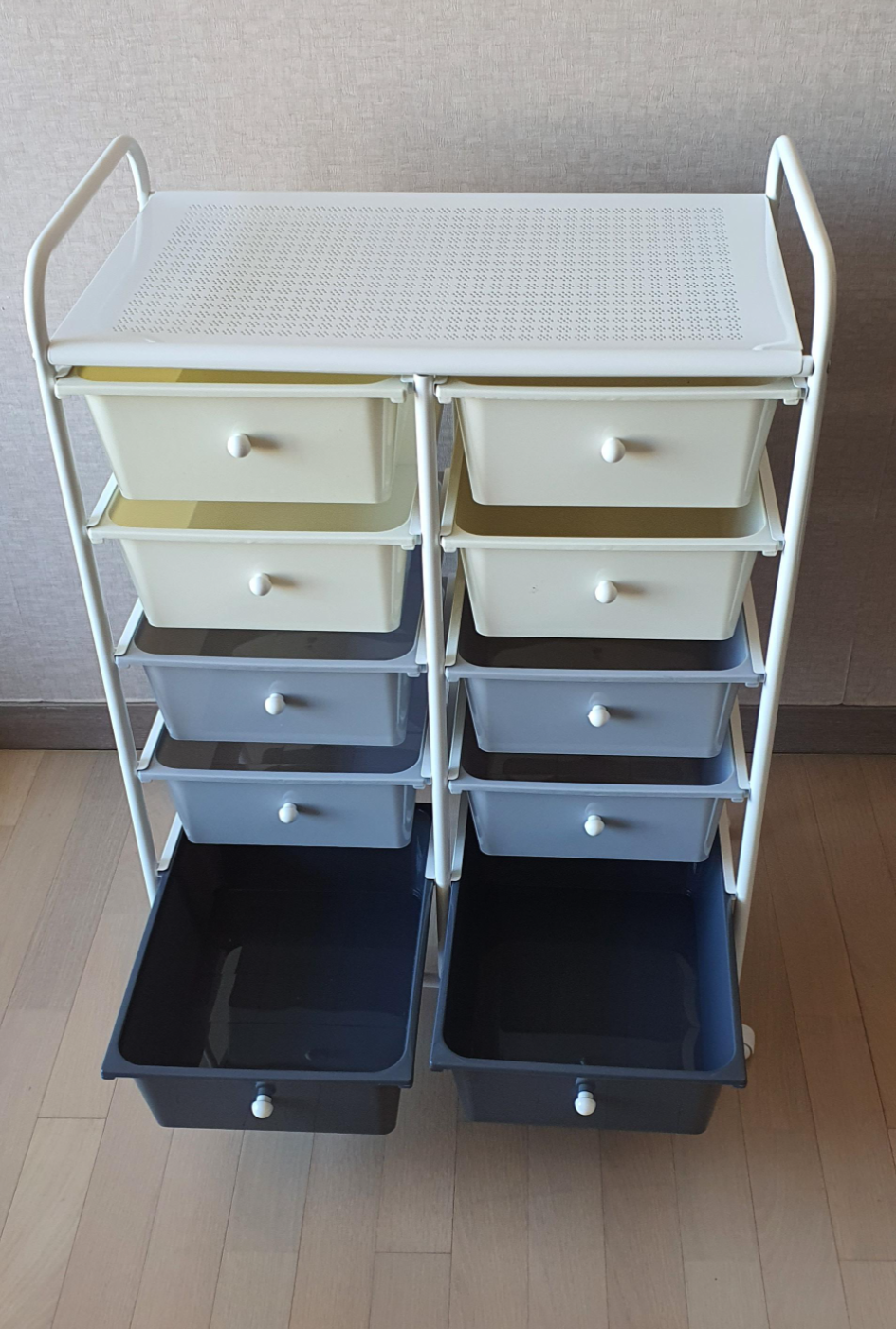 마지막에 각 수납함에 손잡이를 볼트로 돌려서 달아주고 수납함들을 집어넣어준 후 맨 위에 거치대용 판을 얹어 주면 조립이 완료됩니다.