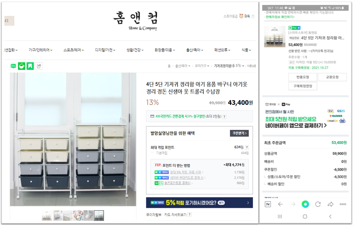 네이버 스토어에서 홈앤컴 이라는 곳에서 구매한 4단&5단 아기 옷+기저귀 정리용 이동식 수납함입니다.